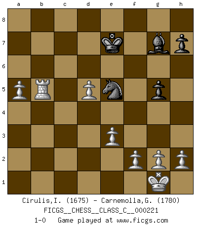 Last move : 1-0 2015 December 9 12:40:11 [Event "FICGS__CHESS__CLASS_C__000221"] [Site "FICGS"] [Date "2015.05.05"] [Round "1"] [White "Cirulis,Ilmars"] [Black "Carnemolla,Giampaolo"] [Result "1-0"] [WhiteElo "1675"] [BlackElo "1780"] 1.b4 e5 2.a3 d5 3.Bb2 f6 4.e3 c5 5.Bxe5 fxe5 6.Qh5+ Ke7 7.Qxe5+ Be6 8.Nf3 Nd7 9.Qb2 Qb6 10.Nc3 Ngf6 11.Na4 Qc7 12.bxc5 Ne4 13.Rb1 Nexc5 14.Nc3 b6 15.Nb5 Qb7 16.Be2 Rg8 17.O-O g5 18.Nfd4 Bg7 19.c4 Raf8 20.Qc2 a6 21.Nxe6 Nxe6 22.cxd5 Qxd5 23.Na7 b5 24.d4 Nb8 25.a4 Qb7 26.Nxb5 axb5 27.Rxb5 Qc6 28.Qb1 Qd6 29.Rb6 Nc6 30.Rb7+ Nc7 31.Rc1 Rf6 32.Bb5 Rb8 33.Rxc6 Rxb7 34.Rxd6 Nxb5 35.Rxf6 Nd6 36.Qxb7+ Nxb7 37.Rb6 Na5 38.Rb5 Nc6 39.d5 Ne5 40.a5 1-0 Polish (Sokolsky) opening Kingside Castling by player White (move 17) Player White won this chess game. Follow this game move after move (download)The winner of the game is the player who makes the next-to-last mistake. (Savielly Tartakover) Es gibt keine einzige Frau, der ich nicht einen Springer vorgeben könnte und trotzdem gewänne. (Robert James Fischer) Con el tiempo, empecé a progresar en partidas decisivas. Tal vez porque me di cuenta de una simple verdad: no solo estaba yo nervioso sino también mi oponente. (Mikhail Tal) Même un GMI sait rarement calculer sur plus de cinq coups une attaque à sacrifices. (Rudolf Spielmann) Fear is the path to the dark side. Fear leads to anger; anger leads to hate; hate leads to suffering. I sense much fear in you. (Master Yoda in Star Wars ep.1)