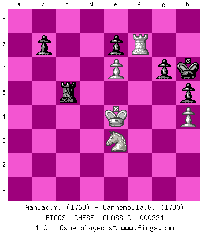 Last move : 1-0 2016 July 25 15:12:46 [Event "FICGS__CHESS__CLASS_C__000221"] [Site "FICGS"] [Date "2015.05.05"] [Round "1"] [White "Aahlad,Yeturu"] [Black "Carnemolla,Giampaolo"] [Result "1-0"] [WhiteElo "1768"] [BlackElo "1780"] 1.e4 Nf6 2.e5 Nd5 3.d4 d6 4.Nf3 g6 5.Bc4 Nb6 6.Bb3 Bg7 7.a4 dxe5 8.a5 Nd5 9.dxe5 c6 10.O-O O-O 11.Qd4 Na6 12.Nc3 Nxc3 13.Qxc3 Bf5 14.Ra4 c5 15.Rh4 Rc8 16.g4 c4 17.gxf5 cxb3 18.Qxb3 Nc5 19.Qe3 gxf5 20.Qg5 Rc6 21.Qxf5 Rg6+ 22.Kh1 Qxa5 23.b4 Qa6 24.Rg1 Rxg1+ 25.Nxg1 Qg6 26.Qxg6 fxg6 27.bxc5 Rxf2 28.Be3 Rxc2 29.Nf3 Rc3 30.Re4 a5 31.Kg2 h6 32.h4 Kf7 33.e6+ Kg8 34.Nd2 a4 35.Kf3 a3 36.Ra4 a2 37.Rxa2 Bd4 38.Nf1 Bxc5 39.Ke4 h5 40.Bxc5 Rxc5 41.Ne3 Kg7 42.Rf2 Kh6 43.Rf7 1-0 Alekhine's defense : Modern, Keres variation Kingside Castling by player White (move 10) Kingside Castling by player Black (move 10) Player White won this chess game. Follow this game move after move (download)A man without frontiers. He didn't divide the East and the West, he brought them together in their admiration for him. (Ljubomir Ljubojevic, about Bobby Fischer's death) Es tut gut, die Entwicklungsperiode von, [...] demokratischem Geist durchdringen zu lassen. Wie undemokratisch wäre es doch beispielsweise, den einen Offizier große Spaziertouren vornehmen zu lassen, während die anderen zu Hause säßen und sich entsetzlich langweilten. (Aaron Nimzowitsch) Aún el Rey más flojo huye despavorido ante la amenaza de un Jaque doble. (Aaron Nimzowitsch) Les échecs, c'est l'imagination. (David Bronstein) After growing wildly for years, the field of computing appears to be reaching its infancy. (John Pierce)