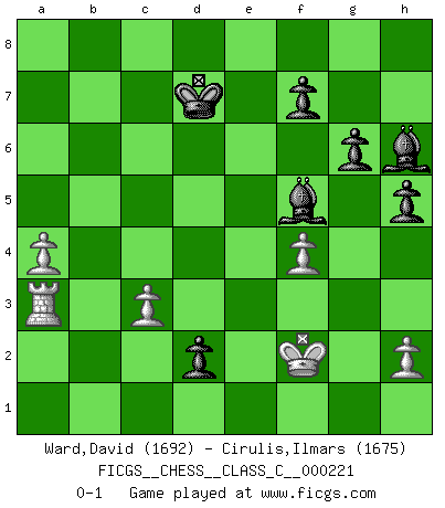 Last move : 0-1 2015 October 19 18:42:40 [Event "FICGS__CHESS__CLASS_C__000221"] [Site "FICGS"] [Date "2015.05.05"] [Round "1"] [White "Ward,David"] [Black "Cirulis,Ilmars"] [Result "0-1"] [WhiteElo "1692"] [BlackElo "1675"] 1.e4 e5 2.Nf3 Nf6 3.d4 exd4 4.e5 Ne4 5.Qxd4 d5 6.exd6 Nxd6 7.Nc3 Nc6 8.Qf4 g6 9.Bd2 Qe7+ 10.Be2 Be6 11.O-O-O Bg7 12.Rhe1 O-O-O 13.Qa4 h6 14.Nb5 a6 15.Nbd4 Nxd4 16.Nxd4 Qf6 17.Bc3 Qf4+ 18.Kb1 Ne4 19.Bxa6 Nxc3+ 20.bxc3 Rxd4 21.Bxb7+ Kxb7 22.Qb5+ Kc8 23.cxd4 Qd6 24.c3 Qa3 25.Qb2 Qa8 26.Re2 Qxg2 27.Qb5 Qf3 28.Rc1 Qf5+ 29.Qxf5 Bxf5+ 30.Kb2 Kd7 31.Ra1 c5 32.a4 cxd4 33.Rd2 Rb8+ 34.Kc1 d3 35.Ra3 h5 36.f4 Bh6 37.Rf2 Rb1+ 38.Kd2 Rb2+ 39.Ke3 Rxf2 40.Kxf2 d2 0-1 Petrov : Modern attack, Main line Queenside Castling by player White (move 11) Queenside Castling by player Black (move 12) Player Black won this chess game. Follow this game move after move (download)Chess is war over the board. The object is to crush the opponents mind. (Bobby Fischer) Ein Remis kann durch Wiederholung von drei Zügen oder durch einen schlechte Zug erreicht werden. (Savielly Grigorievitsch Tartakower) Aquel que toma al Peón de Caballo de la Reina, se pasará la noche a dormir en la calle. (Anónimo) On a dit que l'homme se distingue de l'animal par le fait qu'il achète plus de livres qu'il ne peut en lire. Je voudrais suggérer qu'inclure à la liste des livres quelques livres d'échecs rendrait la distinction manifeste. (Edward Lasker) A clear conscience is usually the sign of a bad memory. (Unknown)