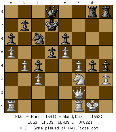 Last move : 0-1 2015 September 25 22:17:22 [Event "FICGS__CHESS__CLASS_C__000221"] [Site "FICGS"] [Date "2015.05.05"] [Round "1"] [White "Ethier,Marc"] [Black "Ward,David"] [Result "0-1"] [WhiteElo "1691"] [BlackElo "1692"] 1.f4 g6 2.e4 d5 3.e5 c5 4.Nf3 Nc6 5.Be2 Bg4 6.d3 e6 7.O-O Nh6 8.c3 Nf5 9.Na3 Be7 10.Ne1 Bxe2 11.Qxe2 Qb6 12.Nac2 h5 13.Nf3 O-O-O 14.Ne3 c4 15.d4 h4 16.Nxf5 gxf5 17.h3 Rdg8 18.Be3 f6 19.b4 fxe5 20.dxe5 Qc7 21.a4 Bd8 22.a5 Kd7 23.Qf2 a6 24.Bb6 Qb8 25.Bxd8 Qxd8 26.g4 fxg4 0-1 Bird's Opening Kingside Castling by player White (move 7) Queenside Castling by player Black (move 13) Player Black won this chess game. Follow this game move after move (download)The only thing Chess players have in common is Chess. (Lodewijk Prins) Frage: Wie viele Autos haben Sie schon zerstört? - Antwort: Nur zwei. (Loek van Wely) Ciertamente, de todas la drogas del mundo, el Ajedrez debe ser el mas placentero permamentemente. (Assiac) Les Echecs ne sont pas pour les âmes timides. Ils requièrent un homme entier, qui ne s'arrête pas aveuglément à ce qui a été déjà établi, mais qui tente individuellement de sonder les profondeurs du jeu. (W. Steinitz) I don't believe in psychology. I believe in good moves. (Bobby Fischer)