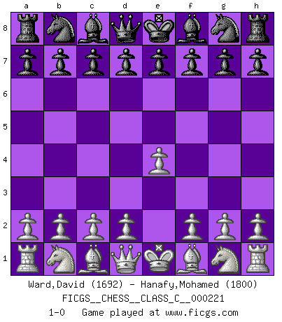 Last move : 1-0 2015 June 15 1:20:6 [Event "FICGS__CHESS__CLASS_C__000221"] [Site "FICGS"] [Date "2015.05.05"] [Round "1"] [White "Ward,David"] [Black "Hanafy,Mohamed"] [Result "1-0"] [WhiteElo "1692"] [BlackElo "1800"] 1.e4 1-0 This chess game has been lost on time (started : 2015.05.05 18:56:19) King's pawn Opening Player White won this chess game. Follow this game move after move (download)I have added these principles to the law: get the Knights into action before both Bishops are developed. (Emanuel Lasker) Schach ist eine Sache der genauen Beurteilung, wann man zuschlagen und wann man sich ducken muss. (Robert James Fischer) ¿Esta Bobby Fischer algo cuerdo?. (Salo Flohr) Les échecs sont un jeu terrible. Si vous n'avez pas le centre, votre adversaire a une position plus libre. Par contre, si vous avez le centre, alors vous avez vraiment quelque chose pour laquelle vous inquiéter ! (Siegbert Tarrasch) Difficult things take a long time, impossible things a little longer. (Author unknown)