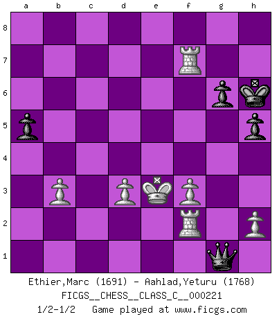 Last move : 1/2-1/2 2015 November 5 20:8:37 [Event "FICGS__CHESS__CLASS_C__000221"] [Site "FICGS"] [Date "2015.05.05"] [Round "1"] [White "Ethier,Marc"] [Black "Aahlad,Yeturu"] [Result "1/2-1/2"] [WhiteElo "1691"] [BlackElo "1768"] 1.e4 c5 2.Nf3 d6 3.d4 cxd4 4.Nxd4 Nf6 5.Nc3 g6 6.Be3 Bg7 7.f3 O-O 8.Qd2 Nc6 9.O-O-O d5 10.exd5 Nxd5 11.Nxc6 bxc6 12.Nxd5 cxd5 13.Qxd5 Qc7 14.Qxa8 Bf5 15.Qxf8+ Kxf8 16.Rd2 h5 17.Be2 Qb8 18.b3 Kg8 19.Bc4 Qe5 20.Bd4 Qa5 21.Bxg7 Kxg7 22.Kd1 Qxa2 23.Re1 a5 24.Rxe7 Qb1+ 25.Ke2 Qg1 26.Rxf7+ Kh6 27.Bd3 Qxg2+ 28.Ke3 Qg1+ 29.Rf2 Bxd3 30.cxd3 1/2-1/2 Sicilian : Dragon, Yugoslav attack, 7...O-O Kingside Castling by player Black (move 7) Queenside Castling by player White (move 9) This chess game ended in a draw. Follow this game move after move (download)Bobby Fischer's current state of mind is indeed a tragedy. One of the world's greatest Chess players - the pride and sorrow of American Chess. (Frank Brady) Fischer machte Schach einfach zu einer aufregenden Sache, wann immer er sich ans Brett setzte. (Raymond Keene) Entre mas años cumplo, mas valoro los Peones. (Keres) Les Echecs sont affaire de jugement sensible. Savoir quand frapper et quand esquiver. (Fischer) Warrior pose battles inner weakness and wins focus. You see that there is no war within you. You're on your own side, and you are your own strength. (Terri Guillemets)