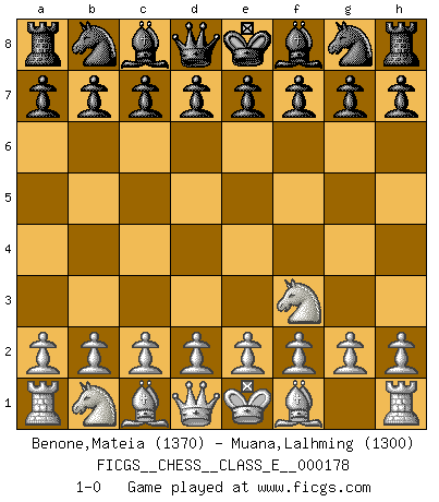 Last move : 1-0 2015 June 18 1:28:44 [Event "FICGS__CHESS__CLASS_E__000178"] [Site "FICGS"] [Date "2015.05.07"] [Round "1"] [White "Benone,Mateia"] [Black "Muana,Lalhming"] [Result "1-0"] [WhiteElo "1370"] [BlackElo "1300"] 1.Nf3 1-0 This chess game has been lost on time (started : 2015.05.07 17:44:16) Reti Opening Player White won this chess game. Follow this game move after move (download)Chess is a fighting game which is purely intellectual and includes chance. (Richard Reti) Sicherlich können nur Meister einen Stil haben. Daß ein nicht-Meister auch nur ein einziges Mal in seinem Leben eine Partie folgerecht durchführte, habe ich niemals bemerkt. (Emanuel Lasker) Ciertamente, de todas la drogas del mundo, el Ajedrez debe ser el mas placentero permamentemente. (Assiac) Psychologiquement, tu dois avoir confiance en toi même, mais cette confiance doit être basée sur des faits. (Robert Fischer) What doesn't kill us makes us stronger. (Friedrich Nietzsche)