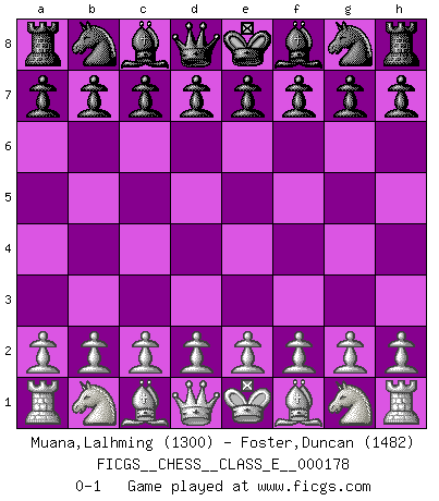 Last move : 0-1 2015 June 17 1:25:6 [Event "FICGS__CHESS__CLASS_E__000178"] [Site "FICGS"] [Date "2015.05.07"] [Round "1"] [White "Muana,Lalhming"] [Black "Foster,Duncan"] [Result "0-1"] [WhiteElo "1300"] [BlackElo "1482"] 0-1 This chess game has been lost on time (started : 2015.05.07 17:44:16) Player Black won this chess game. Follow this game move after move (download)Pawns are born free, yet they are everywhere in chains. (Rick Kennedy) Gott hat gewollt, dass ich Champion werde. (Surab Azmajparaschvili) No es una movida, aún la mejor movida que tu debas buscar, sino un plan comprensible. (Eugene Znosko-Borovsky) A chaque perte on perd un peu de soi. (Joël Lautier) If you have any trouble condescending, find a Unix user to show you how it's done. (Scott Adams)