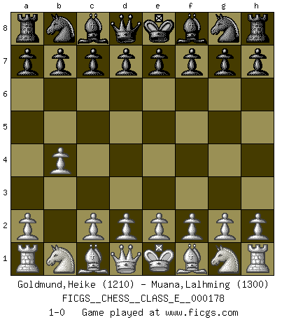 Last move : 1-0 2015 June 17 1:25:6 [Event "FICGS__CHESS__CLASS_E__000178"] [Site "FICGS"] [Date "2015.05.07"] [Round "1"] [White "Goldmund,Heike"] [Black "Muana,Lalhming"] [Result "1-0"] [WhiteElo "1210"] [BlackElo "1300"] 1.b4 1-0 This chess game has been lost on time (started : 2015.05.07 17:44:16) Polish (Sokolsky) opening Player White won this chess game. Follow this game move after move (download)The chessboard is the world, the pieces are the phenomena of the Universe, the rules of the game are what we call the laws of Nature and the player on the other side is hidden from us. (Thomas Huxley) Es ist schade, dass viele Schachsportler vergessen, wie wichtig Auftreten und angemessene Kleidung sind. (Alexandra Kosteniuk) Si un gobernante no entiende al Ajedrez, ¿como puede governar él un reinado?. (El Rey Khusros II) On a dit que l'homme se distingue de l'animal par le fait qu'il achète plus de livres qu'il ne peut en lire. Je voudrais suggérer qu'inclure à la liste des livres quelques livres d'échecs rendrait la distinction manifeste. (Edward Lasker) Children in the dark cause accidents, accidents in the dark cause children. (Unknown)