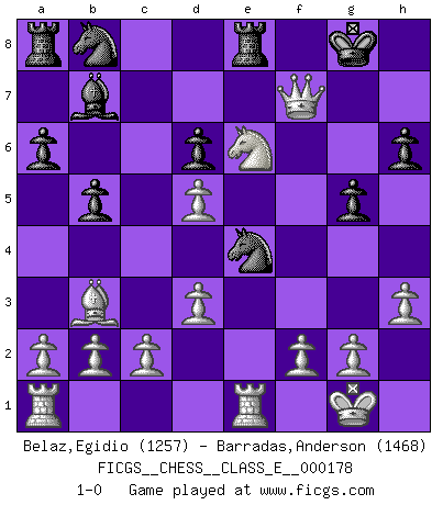 Last move : 1-0 2015 May 28 21:49:18 [Event "FICGS__CHESS__CLASS_E__000178"] [Site "FICGS"] [Date "2015.05.07"] [Round "1"] [White "Belaz,Egidio"] [Black "Barradas,Anderson"] [Result "1-0"] [WhiteElo "1257"] [BlackElo "1468"] 1.e4 e5 2.Nf3 Nf6 3.Bc4 Bc5 4.Nc3 a6 5.Nxe5 O-O 6.O-O Re8 7.Nxf7 Qe7 8.d3 Kf8 9.Ng5 d5 10.exd5 b5 11.Bb3 Bb7 12.Ne6+ Kf7 13.Bg5 h6 14.Bf4 Bd6 15.Qf3 g5 16.Bxd6 cxd6 17.Rfe1 Kg8 18.h3 Qf7 19.Ne4 Nxe4 20.Qxf7+ 1-0 Petrov : Italian variation Kingside Castling by player Black (move 5) Kingside Castling by player White (move 6) Player White won this chess game. Follow this game move after move (download)In Chess, as it is played by masters, chance is practically eliminated. (Emanuel Lasker) In Buenos Aires ist es nicht mein vorrangiges Ziel ein starkes Turnier zu organisieren, sondern ein Turnier für Gentlemen. Ich würde nie Kamsky einladen. Ich mag keine Probleme. (Miguel Najdorf) No nos podemos resistir a la fascinación de un sacrificio ya que la pasión por los sacrificios es parte de la naturaleza de un jugador de Ajedrez. (Rudolf Spielman) Les échecs sont un jeu terrible. Si vous n'avez pas le centre, votre adversaire a une position plus libre. Par contre, si vous avez le centre, alors vous avez vraiment quelque chose pour laquelle vous inquiéter ! (Siegbert Tarrasch) Wisdom begins at the end. (Daniel Webster)