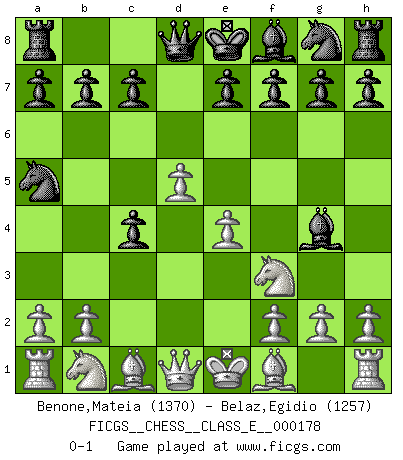 Last move : 0-1 2015 June 24 14:4:8 [Event "FICGS__CHESS__CLASS_E__000178"] [Site "FICGS"] [Date "2015.05.07"] [Round "1"] [White "Benone,Mateia"] [Black "Belaz,Egidio"] [Result "0-1"] [WhiteElo "1370"] [BlackElo "1257"] 1.Nf3 d5 2.d4 Nc6 3.c4 dxc4 4.d5 Na5 5.e4 Bg4 0-1 This chess game has been lost on time (started : 2015.05.07 17:44:16) Reti Opening Player Black won this chess game. Follow this game move after move (download)A passed Pawn increases in strength as the number of pieces on the board diminishes. (Capablanca) Ich habe Kasparov in Rente geschickt. (Veselin Topalov) La belleza de un movimiento no se refleja solo en su apariencia, sino en el pensamiento detrás de él. (Siegbert Tarrasch) Roi des jeux et jeu des rois, les échecs portent en eux un sentiment d'infini. Ils donnent à celui qui s'est efforcé d'en approfondir les arcanes l'impression de n'être pas à la mesure de l'homme; en fait, ils constituent un résumé de l'univers, un microcosme, et figurent cette grande échelle qui, dans les plans de la lumière descend jusqu'à la matière, qui des abîmes insondables remonte jusqu'en l'infini de Dieu. (Pyrame) There are two kinds of people in the world, my friend. Those who have a loaded gun and those who dig. You dig ! (Blondie in The Good, The Bad and The Ugly)