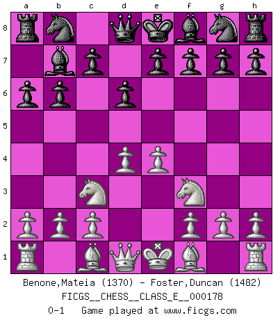 Last move : 0-1 2015 June 21 13:41:23 [Event "FICGS__CHESS__CLASS_E__000178"] [Site "FICGS"] [Date "2015.05.07"] [Round "1"] [White "Benone,Mateia"] [Black "Foster,Duncan"] [Result "0-1"] [WhiteElo "1370"] [BlackElo "1482"] 1.Nf3 b6 2.e4 Bb7 3.Nc3 d6 4.d4 a6 0-1 This chess game has been lost on time (started : 2015.05.07 17:44:16) Reti Opening Player Black won this chess game. Follow this game move after move (download)A thorough understanding of the typical mating continuations makes the most complicated sacrificial combinations leading up to them not only not difficult, but almost a matter of course. (Siegbert Tarrasch) Zum Sieg gelangt man nicht, wenn man gut, sondern nur wenn man besser spielt (Savielly Grigorievitsch Tartakower) Un jugador que trata de regresar una movida en el Ajedrez es un futuro carterista. (Richard Fenton) Votre seul travail dans les ouvertures est d'obtenir un milieu de partie jouable. (Lajos Portish) The absolute truth is the thing that makes people laugh. (Carl Reiner)