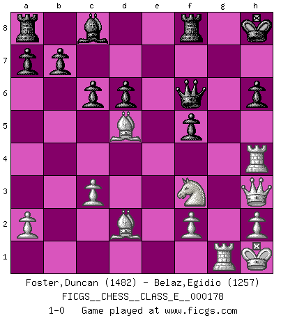 Last move : 1-0 2015 June 6 17:31:13 [Event "FICGS__CHESS__CLASS_E__000178"] [Site "FICGS"] [Date "2015.05.07"] [Round "1"] [White "Foster,Duncan"] [Black "Belaz,Egidio"] [Result "1-0"] [WhiteElo "1482"] [BlackElo "1257"] 1.e4 e5 2.Nf3 Nc6 3.d4 exd4 4.Bc4 Nf6 5.e5 Ne4 6.Bd5 Nc5 7.O-O Ne6 8.Re1 Bc5 9.Nbd2 Nf4 10.Ne4 Bb4 11.Bxf4 O-O 12.c3 dxc3 13.bxc3 Be7 14.Neg5 Bxg5 15.Nxg5 Qe7 16.Qh5 h6 17.Nf3 Kh8 18.Re4 f6 19.exf6 Qxf6 20.Bd2 Ne7 21.Rf4 Nf5 22.Re1 d6 23.g4 g6 24.Qh3 Qg7 25.gxf5 gxf5 26.Kh1 c6 27.Rg1 Qf6 28.Rh4 1-0 Scotch gambit : Dubois-Reti defense Kingside Castling by player White (move 7) Kingside Castling by player Black (move 11) Player White won this chess game. Follow this game move after move (download)An attack on the wing should be met by play in the center. (Nimzovitch) Ivan Sokolov treibt mich als Beifahrer an mit go Loeky go - . (Loek van Wely) Un entendimiento minucioso de las típicas continuaciones de mate hacen de las mas complicadas combinaciones de sacrificio que conducen hacia ellas no solo no dificiles, sino casi un asunto de rutina. (Siegbert Tarrasch) Un journaliste : 'Vous préférez avoir une dame de plus sur l'échiquier ou au lit ?' Boris Spassky : 'Ca dépend de la position.' The modern world has divided itself into Conservatives and Progressives. The business of Progressives is to go on making mistakes. The business of the Conservatives is to prevent the mistakes from being corrected. (G.K. Chesterton)