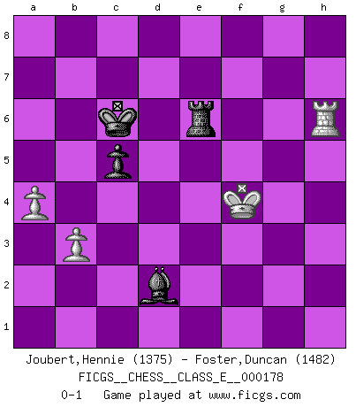 Last move : 0-1 2015 June 18 8:26:21 [Event "FICGS__CHESS__CLASS_E__000178"] [Site "FICGS"] [Date "2015.05.07"] [Round "1"] [White "Joubert,Hennie"] [Black "Foster,Duncan"] [Result "0-1"] [WhiteElo "1375"] [BlackElo "1482"] 1.d4 b6 2.c4 Bb7 3.Nc3 g6 4.e4 Bg7 5.f3 e6 6.Be3 a6 7.Qd2 h6 8.Nge2 d6 9.Nc1 Ne7 10.Nd3 Nd7 11.Be2 g5 12.h4 gxh4 13.Rxh4 Nf5 14.Rh5 Nxe3 15.Qxe3 Nf6 16.Rh2 Qe7 17.O-O-O O-O-O 18.Kb1 Kb8 19.f4 c5 20.e5 dxe5 21.fxe5 Nd7 22.Bf3 cxd4 23.Qxd4 Bxf3 24.gxf3 Nc5 25.Qe3 Nxd3 26.Rxd3 Rxd3 27.Qxd3 Bxe5 28.Rh5 f5 29.Qe3 Qd6 30.Kc2 Bf4 31.Qd3 Qxd3+ 32.Kxd3 Rd8+ 33.Kc2 Rd2+ 34.Kb3 Rd3 35.Kc2 Rxf3 36.Ne2 Bg5 37.Rh2 e5 38.Nc3 e4 39.Nd5 Kb7 40.b3 f4 41.Re2 e3 42.Kd3 h5 43.Rh2 h4 44.Ke4 Rf2 45.Rh1 Kc6 46.a3 Rd2 47.Nxf4 e2 48.Re1 h3 49.Nxe2 Bh4 50.Rh1 Rxe2+ 51.Kd3 Rg2 52.Rxh3 Be1 53.Rh6+ Kc7 54.c5 Rd2+ 55.Ke3 bxc5 56.Rxa6 Rd5 57.Ra4 Kb6 58.Ke4 Rd7 59.Rc4 Kb5 60.a4+ Kc6 61.Ke5 Bb4 62.Ke4 Rd1 63.Ke5 Rd3 64.Rh4 Re3+ 65.Kf4 Bd2 66.Rh6+ Re6 0-1 Queen's pawn : English defense Queenside Castling by player White (move 17) Queenside Castling by player Black (move 17) 10 pieces endgame at move 52 : White KRPPP , Black KRBPP WHITE : King + 1 Rook 3 Pawns BLACK : King + 1 Rook 1 Bishop 2 Pawns 9 pieces endgame at move 55 : White KRPP , Black KRBPP WHITE : King + 1 Rook 2 Pawns BLACK : King + 1 Rook 1 Bishop 2 Pawns 8 pieces endgame at move 56 : White KRPP , Black KRBP WHITE : King + 1 Rook 2 Pawns BLACK : King + 1 Rook 1 Bishop 1 Pawn Player Black won this chess game. Follow this game move after move (download)Botvinnik tried to take the mystery out of Chess, always relating it to situations in ordinary life. He used to call Chess a typical inexact problem similar to those which people are always having to solve in everyday life. (Garry Kasparov) Deine Wertungszahl - vorausgesetzt einige Jahre schachliche Anstrengung - entspricht etwa dem zehnfachen Deines IQ plus 1000. (Jonathan Levitt) La enorme capacidad mental, en la que sin ella no puede un jugador de Ajedrez existir, es demasiado requerida por el Ajedrez al grado de que nunca podrá liberar su mente de este juego. (Albert Einstein) Il n'y a pas de prix trop élevé au scalp de l'ennemi. (Koblentz) Art disturbs, science reassures. (Georges Braque, Le Jour et la Nuit)