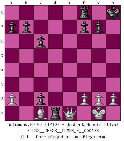 Last move : 0-1 2015 July 2 22:21:33 [Event "FICGS__CHESS__CLASS_E__000178"] [Site "FICGS"] [Date "2015.05.07"] [Round "1"] [White "Goldmund,Heike"] [Black "Joubert,Hennie"] [Result "0-1"] [WhiteElo "1210"] [BlackElo "1375"] 1.e4 c6 2.d4 d5 3.Nc3 dxe4 4.Nxe4 Bf5 5.Ng3 Bg6 6.Nf3 Nd7 7.Bd3 Ngf6 8.O-O e6 9.Bg5 Be7 10.Re1 O-O 11.Ne5 Bxd3 12.Qxd3 h6 13.Bd2 Qc7 14.Nxd7 Qxd7 15.Ne4 Rad8 16.c3 e5 17.Nxf6+ Bxf6 18.Re4 exd4 19.Qg3 dxc3 20.Bxh6 c2 21.R4e1 Kh8 22.Bf4 Bxb2 23.Rac1 Bxc1 24.Bxc1 Qd1 25.Qc3 Qxe1+ 26.Qxe1 Rd1 0-1 Caro-Kann : Classical variation Kingside Castling by player White (move 8) Kingside Castling by player Black (move 10) Player Black won this chess game. Follow this game move after move (download)I don't believe in psychology. I believe in good moves. (Bobby Fischer) Ein Kibitz ist einer, der deinem Gegner gute Ratschläge gibt. (Andrew Soltis) Aquellos que dicen entender al Ajedrez, no entienden nada. (Robert Hubner) Le génie consiste à savoir transgresser les règles au moment opportun. (Teichmann) The project of the man are lower than those of the sky. (Chinese proverb)