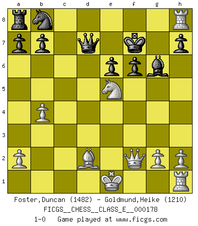 Last move : 1-0 2015 June 23 18:40:1 [Event "FICGS__CHESS__CLASS_E__000178"] [Site "FICGS"] [Date "2015.05.07"] [Round "1"] [White "Foster,Duncan"] [Black "Goldmund,Heike"] [Result "1-0"] [WhiteElo "1482"] [BlackElo "1210"] 1.e4 d5 2.exd5 Qxd5 3.Nc3 Qa5 4.d4 Nf6 5.Nf3 Bf5 6.Bc4 e6 7.Bd2 c6 8.Ne4 Qc7 9.Nxf6+ gxf6 10.Qe2 Bxc2 11.Rc1 Bg6 12.d5 cxd5 13.Bxd5 Bc5 14.Bxe6 fxe6 15.b4 Bxf2+ 16.Qxf2 Qd6 17.Rc8+ Kf7 18.Rxh8 Qd7 19.Ne5+ 1-0 Scandinavian defense Player White won this chess game. Follow this game move after move (download)Up to this point White has been following well-known analysis. But now he makes a fatal error: he begins to use his own head. (Siegbert Tarrasch) Wenn Du nicht kämpfst, um anderen etwas zu beweisen, sondern nur für Dich selbst, dann bist du fast unbesiegbar. (Garry Kasparov) Si un gobernante no entiende al Ajedrez, ¿como puede governar él un reinado?. (El Rey Khusros II) On n'a jamais que l'âge auquel on a commence à jouer aux échecs car après on cesse de vieillir. (Capablanca) The worth of a book is to be measured by what you can carry away from it. (James Bryce)