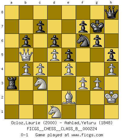 Last move : 0-1 2015 December 13 8:48:13 [Event "FICGS__CHESS__CLASS_B__000224"] [Site "FICGS"] [Date "2015.05.09"] [Round "1"] [White "Ocloz,Laurie"] [Black "Aahlad,Yeturu"] [Result "0-1"] [WhiteElo "2000"] [BlackElo "1848"] 1.d4 Nf6 2.c4 e6 3.Nf3 b6 4.a3 Be7 5.Nc3 Bb7 6.d5 O-O 7.e4 d6 8.Be2 Nbd7 9.Qc2 a5 10.Nd4 Nc5 11.b3 Nfd7 12.Rb1 Bg5 13.b4 axb4 14.axb4 Bxc1 15.Rxc1 Na6 16.Qb2 Qf6 17.Rd1 Qf4 18.O-O Rfe8 19.g3 Qf6 20.Ncb5 Qe7 21.Ra1 Nf6 22.f3 e5 23.Nf5 Qd8 24.Ra3 g6 25.Ne3 h5 26.h4 Kh7 27.Nc3 Qd7 28.Kh2 Reb8 29.Rfa1 Qe7 30.Ra4 Qe8 31.R1a2 Qf8 32.Qa1 Qh8 33.Rxa6 Bxa6 34.Rxa6 Rxa6 35.Qxa6 Ra8 36.Qb5 Ra3 37.Ned1 Kg7 0-1 This chess game has been lost on time (started : 2015.05.09 0:24:38) Queen's Indian : Petrosian system Kingside Castling by player Black (move 6) Kingside Castling by player White (move 18) Player Black won this chess game. Follow this game move after move (download)No other master has such a terrific will to win. At the board he radiates danger, and even the strongest opponents tend to freeze, like rabbits when they smell a panther. Even his weaknesses are dangerous. As white, his opening game is predictable - you can make plans against it - but so strong that your plans almost never work. In the middle game his precision and invention are fabulous, and in the end game you simply cannot beat him. (Anonymous German Expert) Sitze auf Deine Hände. (Siegbert Tarrasch) Los Peones son nacidos libres, y aún así, se encuentran por doquier encadenados. (Rick Kennedy) Les échecs sont un jeu terrible. Si vous n'avez pas le centre, votre adversaire a une position plus libre. Par contre, si vous avez le centre, alors vous avez vraiment quelque chose pour laquelle vous inquiéter ! (Siegbert Tarrasch) There are two types of people in this world, good and bad. The good sleep better, but the bad seem to enjoy the waking hours much more. (Woody Allen)