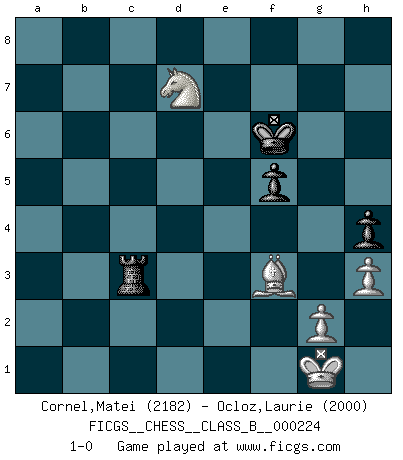 Last move : 1-0 2015 December 4 7:57:37 [Event "FICGS__CHESS__CLASS_B__000224"] [Site "FICGS"] [Date "2015.05.09"] [Round "1"] [White "Cornel,Matei"] [Black "Ocloz,Laurie"] [Result "1-0"] [WhiteElo "2182"] [BlackElo "2000"] 1.e4 c5 2.d4 cxd4 3.Nf3 e5 4.c3 Nc6 5.cxd4 exd4 6.Nxd4 Nf6 7.Nc3 Bb4 8.Nxc6 bxc6 9.Bd3 O-O 10.O-O Re8 11.Qc2 Bd6 12.h3 Bc7 13.Bg5 h6 14.Bh4 Qe7 15.Rae1 Qc5 16.Bxf6 gxf6 17.a3 a5 18.Kh1 Bf4 19.e5 d5 20.exd6 Rxe1 21.Rxe1 Be6 22.Ne4 Qxc2 23.Bxc2 Be5 24.Nc5 Rd8 25.d7 Kf8 26.f4 Bxf4 27.Rxe6 fxe6 28.Nxe6+ Ke7 29.Nxf4 Rxd7 30.Nd3 c5 31.Nxc5 Rd2 32.Be4 Rxb2 33.Nb7 f5 34.Bf3 a4 35.Nc5 Ra2 36.Nxa4 Rxa3 37.Nb2 Kf6 38.Kh2 Kg5 39.Nc4 Ra2 40.Ne5 h5 41.Bd5 Ra3 42.Bc6 Kf4 43.Ng6+ Kg5 44.Nf8 Rc3 45.Bf3 h4 46.Kg1 Kf6 47.Nd7+ 1-0 This chess game has been lost on time (started : 2015.05.09 0:24:38) Sicilian : Andreaschek gambit Kingside Castling by player Black (move 9) Kingside Castling by player White (move 10) 10 pieces endgame at move 36 : White KBNPPP , Black KRPP WHITE : King + 1 Bishop 1 Knight 3 Pawns BLACK : King + 1 Rook 2 Pawns 9 pieces endgame at move 36 : White KBNPP , Black KRPP WHITE : King + 1 Bishop 1 Knight 2 Pawns BLACK : King + 1 Rook 2 Pawns Player White won this chess game. Follow this game move after move (download)Dazzling combinations are for the many, shifting wood is for the few. (Georg Kieninger) Das Schach hält seine Meister in eigenen Banden, Fesseln; auf vielerlei Weise formt es ihren Geist, so dass die innere Freiheit selbst des Stärksten beeinflusst wird. (Albert Einstein) Aquel que ve no otra dirección en el juego que la de dar Jaque Mate a su oponente, nunca será un buen jugador de Ajedrez. (Euwe) Il n'y a pas eu de défaite parce que je ne crois pas que cet ordinateur ait jamais existé. IBM a triché en refusant d'imprimer les modes de recherche de la machine. C'est évident, pendant le match, des coups décisifs ont été joués par des êtres humains. Aujourd'hui, les meilleurs spécialistes en informatique ne peuvent toujours pas expliquer comment Deep-Blue a pu jouer contre la logique des ordinateurs. IBM a gagné une guerre de communication, mais ils sont incapables de prouver que l'ordinateur a gagné tout seul. (Garry Kasparov) When the going gets tactical, the computers get going. (Hyatt)
