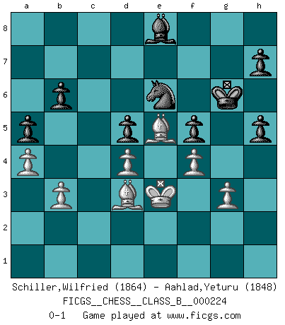 Last move : 0-1 2016 April 3 8:45:7 [Event "FICGS__CHESS__CLASS_B__000224"] [Site "FICGS"] [Date "2015.05.09"] [Round "1"] [White "Schiller,Wilfried"] [Black "Aahlad,Yeturu"] [Result "0-1"] [WhiteElo "1864"] [BlackElo "1848"] 1.d4 Nf6 2.c4 e6 3.Nf3 b6 4.g3 Ba6 5.b3 Bb4+ 6.Bd2 Be7 7.Bg2 c6 8.Bc3 d5 9.Ne5 Nfd7 10.Nxd7 Nxd7 11.Nd2 O-O 12.O-O f5 13.a4 Nf6 14.Qc2 Rb8 15.Nf3 Ne4 16.Ne5 Bb7 17.Bb2 a5 18.f3 Ng5 19.Rad1 Nf7 20.Nd3 Bf6 21.Nf4 Qd7 22.Rfe1 Rfe8 23.e4 g6 24.h4 Bg7 25.exf5 exf5 26.Bf1 Re7 27.Kg2 Rbe8 28.Rxe7 Qxe7 29.Rd2 Bh6 30.Re2 Qd7 31.Rxe8+ Qxe8 32.cxd5 cxd5 33.Qc7 Bxf4 34.Qxf4 Qc6 35.Ba3 Kg7 36.Qd2 Qe6 37.Qf4 Qc6 38.Qe3 Qc2+ 39.Kg1 Qc7 40.f4 Kf6 41.Qe8 Qd8 42.Qxd8+ Nxd8 43.Bd6 Ne6 44.h5 Kf7 45.Be5 Bc6 46.Kf2 gxh5 47.Bd3 Kg6 48.Ke3 Be8 0-1 Queen's Indian : Nimzovich variation (exaggerated Fianchetto) Kingside Castling by player Black (move 11) Kingside Castling by player White (move 12) Player Black won this chess game. Follow this game move after move (download)Chess is no whit inferior to the violin, and we have a large number of professional violinists. (Mikhail Botvinnik) Wenn ich gewinne bin ich ein Genie. Wenn nicht, dann bin ich keines. (Robert James Fischer) Por tratar de evitar la pérdida de una pieza, muchas personas han perdido una partida de Ajedrez. (Savielly Tartakover) Ne tendez aucun piège pour le plaisir ! Ne jouez rien dans l'espoir que l'adversaire réagisse de façon stupide ! Prenez toujours pour acquis que l'adversaire va trouver le meilleur coup ! Ne jouez jamais de coup dans l'espoir que l'adversaire ne voie pas la menace ! Chacun de vos coups doit améliorer la position d'une façon ou d'une autre. An expert is a man who has made all the mistakes which can be made in a very narrow field. (Niels Bohr)