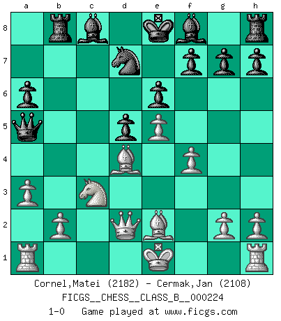 Last move : 1-0 2015 July 13 16:28:54 [Event "FICGS__CHESS__CLASS_B__000224"] [Site "FICGS"] [Date "2015.05.09"] [Round "1"] [White "Cornel,Matei"] [Black "Cermak,Jan"] [Result "1-0"] [WhiteElo "2182"] [BlackElo "2108"] 1.e4 e6 2.d4 d5 3.Nc3 Nf6 4.e5 Nfd7 5.f4 c5 6.Nf3 Nc6 7.Be3 a6 8.Qd2 b5 9.a3 Qa5 10.Be2 b4 11.Nd1 Rb8 12.c3 bxc3 13.Nxc3 cxd4 14.Nxd4 Nxd4 15.Bxd4 1-0 French : Steinitz, Boleslavsky variation Player White won this chess game. Follow this game move after move (download)When you don't know what to play, wait for an idea to come into your opponent's mind. You may be sure that idea will be wrong. (Siegbert Tarrasch) Du kannst im Schach nur gut werden, wenn du das Spiel liebst. (Robert James Fischer) Fischer era un maestro de claridad y un Rey del posicionamiento astuto. Sus oponentes podían ver hacia donde se dirigía pero eran impotentes para detenerlo. (Bruce Pandolfini) Il n'y a pas de prix trop élevé au scalp de l'ennemi. (Koblentz) The only thing that matters is the evidence. (Horatio Caine, C.S.I. Miami)
