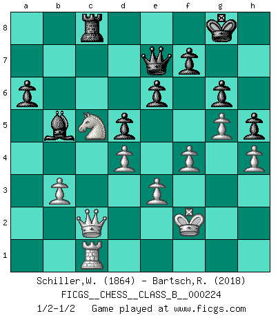 Last move : 1/2-1/2 2015 June 21 19:51:46 [Event "FICGS__CHESS__CLASS_B__000224"] [Site "FICGS"] [Date "2015.05.09"] [Round "1"] [White "Schiller,Wilfried"] [Black "Bartsch,Reinhard Andrea"] [Result "1/2-1/2"] [WhiteElo "1864"] [BlackElo "2018"] 1.d4 Nf6 2.c4 e6 3.Nf3 d5 4.Nc3 c6 5.Bg5 Nbd7 6.e3 Be7 7.cxd5 cxd5 8.h3 a6 9.Bf4 b5 10.a4 b4 11.Nb1 O-O 12.Nbd2 Bb7 13.a5 Rc8 14.Bd3 Rc6 15.Qe2 Nh5 16.Bh2 Nhf6 17.O-O Qa8 18.Ne1 Rfc8 19.Nb3 Rc4 20.f3 Bc6 21.Nc1 Bb5 22.Na2 b3 23.Nc3 Nb8 24.Bxc4 Bxc4 25.Nd3 Nc6 26.Qd2 Qb7 27.Na4 Nd7 28.Rfc1 Bd8 29.Bd6 h6 30.f4 Bxa5 31.Qd1 Nf6 32.Ndc5 Qb5 33.Nc3 Bxc3 34.Rxc3 Nb4 35.Nxb3 Ne4 36.Bxb4 Qxb4 37.R3c1 Ng3 38.Nc5 Ne2+ 39.Kh2 Nxc1 40.Qxc1 Qb8 41.b3 Bb5 42.Qc2 Qd6 43.Qd1 g6 44.g4 Qe7 45.Rc1 Kg7 46.Qf3 Qf6 47.Kg3 Rb8 48.Qf2 Qe7 49.h4 Rh8 50.Qc2 Rb8 51.Qg2 h5 52.g5 Kg8 53.Qb2 Rc8 54.Kf2 Qc7 55.Qd2 Qe7 56.Qc2 1/2-1/2 Queen's pawn game Kingside Castling by player Black (move 11) Kingside Castling by player White (move 17) This chess game ended in a draw. Follow this game move after move (download)During a Chess competition a Chessmaster should be a combination of a beast of prey and a monk. (Alexander Alekhine) Ich verstehe den Grund nicht, warum die Aufteilung in Frauen und Männer überhaupt im Schach besteht. (Judith Polgar) El Ajedrez detiene a su maestro dentro de sus propios vínculos, encadenando la mente y el cerebro, por lo que la libertad interior del mas fuerte debe sufrir. (Albert Einstein) Ce qui caractérise les parties de combat, c'est que si le défenseur a constamment de difficiles problèmes à résoudre, l'attaquant doit chercher sans relâche de nouvelles possibilités d'attaque. (Koblentz) When a man with money meets a man with experience, the man with experience leaves with money and the man with money leaves with experience. (Anonymous)