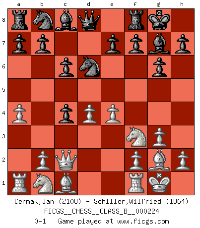 Last move : 0-1 2015 June 21 1:41:42 [Event "FICGS__CHESS__CLASS_B__000224"] [Site "FICGS"] [Date "2015.05.09"] [Round "1"] [White "Cermak,Jan"] [Black "Schiller,Wilfried"] [Result "0-1"] [WhiteElo "2108"] [BlackElo "1864"] 1.d4 d5 2.c4 c6 3.g3 Nf6 4.Bg2 g6 5.Nf3 dxc4 6.O-O Bg7 7.a4 Ne4 8.Qc2 Nd6 9.e4 O-O 0-1 This chess game has been lost on time (started : 2015.05.09 0:24:38) QGD Slav defense Kingside Castling by player White (move 6) Kingside Castling by player Black (move 9) Player Black won this chess game. Follow this game move after move (download)The winner of the game is the player who makes the next-to-last mistake. (Savielly Tartakover) Ich las kürzlich ein Buch von Nietzsche. Er sagte Religion verdumme nur die Menschen. Ich stimme zu. (Robert James Fischer) Algunos sacrificios son sólidos, los demás son míos. (Mikhail Tal) Même un GMI sait rarement calculer sur plus de cinq coups une attaque à sacrifices. (Rudolf Spielmann) Knowledge rests not upon truth alone, but upon error also. (Carl G. Jung)