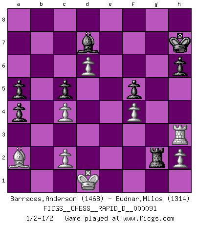 Last move : 1/2-1/2 2015 August 4 13:8:35 [Event "FICGS__CHESS__RAPID_D__000091"] [Site "FICGS"] [Date "2015.05.09"] [Round "1"] [White "Barradas,Anderson"] [Black "Budnar,Milos"] [Result "1/2-1/2"] [WhiteElo "1468"] [BlackElo "1314"] 1.e4 e5 2.Nf3 Nc6 3.d4 exd4 4.Nxd4 Nf6 5.Nc3 Bb4 6.Bg5 Qe7 7.Be2 h6 8.Bxf6 Bxc3+ 9.bxc3 Qxf6 10.O-O O-O 11.Nxc6 Qxc6 12.Qd3 Qg6 13.f4 f5 14.e5 c6 15.Rf3 d5 16.exd6 Bd7 17.Qd4 Qf6 18.Bc4+ Kh8 19.Qe5 Rae8 20.Qxf6 Rxf6 21.Rd1 b5 22.Bb3 a5 23.a4 Re4 24.g3 bxa4 25.Ba2 g5 26.c4 gxf4 27.gxf4 Rg6+ 28.Kf2 Rg4 29.Re1 Rxe1 30.Kxe1 Rg2 31.Rh3 Kh7 32.Kd1 c5 1/2-1/2 Scotch : Schmidt variation Kingside Castling by player White (move 10) Kingside Castling by player Black (move 10) This chess game ended in a draw. Follow this game move after move (download)In Fischer's hands, a slight theoretical advantage is as good a being a Queen ahead. (Isaac Kashdan) Schach ist gnadenlos. Du mußt bereit sein zu töten. (Nigel Short) No hay precio que no valga la pena por la cabellera del Rey enemigo. (Koblentz) Même si l'adversaire joue le coup analysé précédemment, recommencez l'analyse en voyant la nouvelle position. Première règle de Blumenfeld It's not a bug - it's an undocumented feature. (Anonymous)