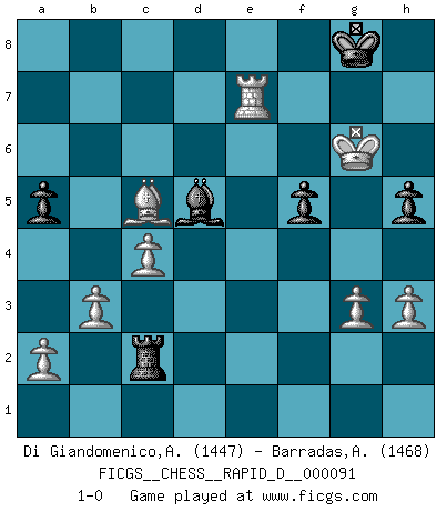 Last move : 1-0 2015 July 9 2:17:1 [Event "FICGS__CHESS__RAPID_D__000091"] [Site "FICGS"] [Date "2015.05.09"] [Round "1"] [White "Di Giandomenico,Alfonso"] [Black "Barradas,Anderson"] [Result "1-0"] [WhiteElo "1447"] [BlackElo "1468"] 1.e4 e5 2.Bc4 Nf6 3.d3 a6 4.Nf3 b5 5.Bb3 c5 6.Nxe5 d5 7.exd5 Bd6 8.Nf3 Nbd7 9.Qe2+ Qe7 10.Qxe7+ Bxe7 11.c4 O-O 12.Nbd2 Re8 13.O-O Bd6 14.Re1 Bb7 15.Bc2 Rxe1+ 16.Nxe1 Re8 17.Nef3 Ne5 18.Kf1 Nxf3 19.Nxf3 h6 20.b3 bxc4 21.dxc4 Ng4 22.h3 Nh2+ 23.Nxh2 Bxh2 24.g3 h5 25.Kg2 Bxg3 26.fxg3 Re2+ 27.Kf3 Rxc2 28.Be3 f5 29.Bxc5 a5 30.Kf4 g6 31.Kg5 Kf7 32.Re1 Bxd5 33.Re7+ Kg8 34.Kxg6 1-0 Bishop's Opening : Berlin defense Kingside Castling by player Black (move 11) Kingside Castling by player White (move 13) Player White won this chess game. Follow this game move after move (download)You can only get good at Chess if you love the game. (Bobby Fischer) Computer sind die einzigen Gegner, die nicht immer eine Ausrede auf Lager haben, wenn sie gegen mich verlieren. (Robert James Fischer) El Ajedrez lo es todo: arte, ciencia y deporte. (Anatoly Karpov) Echiquier : carré parfait, comme la Jérusalem nouvelle décrite par l'auteur de l'Apocalypse, huit cases sur huit, exaltation du chiffre 4, symbole du cosmos aux quatre horizons... où le noir et le blanc, l'ombre et la lumière, le mal et le bien s'entremêlent et se conjuguent. (Robert Couffignal, Le Gambit du poète) Animated gif is worth one mega-word. (Unknown)