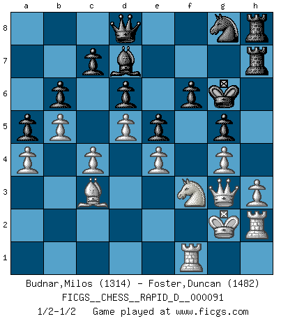 Last move : 1/2-1/2 2015 July 9 14:21:10 [Event "FICGS__CHESS__RAPID_D__000091"] [Site "FICGS"] [Date "2015.05.09"] [Round "1"] [White "Budnar,Milos"] [Black "Foster,Duncan"] [Result "1/2-1/2"] [WhiteElo "1314"] [BlackElo "1482"] 1.e4 b6 2.d4 Bb7 3.Bd3 g6 4.Nf3 d6 5.O-O h6 6.Nc3 a6 7.Be3 Bg7 8.Qd2 e6 9.d5 e5 10.a4 Nd7 11.b4 Ne7 12.b5 a5 13.h3 Nf6 14.Ne2 g5 15.g4 O-O 16.c4 Bc8 17.Ng3 Ng6 18.Rfe1 Nf4 19.Kh2 Nxd3 20.Qxd3 Bd7 21.Bd2 Nh7 22.Nh5 Nf6 23.Nxg7 Kxg7 24.Bc3 Kg6 25.Nd2 Qc8 26.f3 h5 27.Rg1 hxg4 28.fxg4 Rh8 29.Kg2 Rh7 30.Rh1 Qb7 31.Qf3 Rah8 32.Raf1 Ng8 33.Qg3 Qc8 34.Nf3 f6 35.Rh2 Qd8 1/2-1/2 Owen defense Kingside Castling by player White (move 5) Kingside Castling by player Black (move 15) This chess game ended in a draw. Follow this game move after move (download)Chess is a part of culture and if a culture is declining then Chess too will decline. (Mikhail Botvinnik) Ihnen, Herr Lasker, habe ich nur drei Worte zu sagen: Schach und matt. (Siegbert Tarrasch) Un mal día en el Ajedrez, es mejor que cualquier buen día en el trabajo. (Anonymous) Les échecs sont utiles à l'exercice de la faculté de penser et à celle de l'imagination. Car nous devons posséder une méthode élaborée pour atteindre des buts partout où nous devons conduire notre raison. (Leibnitz) Hold em is to stud what chess is to checkers. (Johnny Moss)