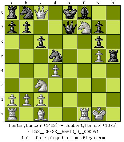 Last move : 1-0 2015 May 25 16:1:41 [Event "FICGS__CHESS__RAPID_D__000091"] [Site "FICGS"] [Date "2015.05.09"] [Round "1"] [White "Foster,Duncan"] [Black "Joubert,Hennie"] [Result "1-0"] [WhiteElo "1482"] [BlackElo "1375"] 1.e4 c6 2.d4 d5 3.Nc3 dxe4 4.f3 exf3 5.Nxf3 Nf6 6.Bd3 Bg4 7.O-O e6 8.h3 Bh5 9.g4 Bg6 10.Bxg6 hxg6 11.Ne5 Rxh3 12.g5 Nd5 13.Qg4 Rh5 14.Nxf7 Qc7 15.Qxe6+ Qe7 16.Qc8+ 1-0 Caro-Kann : Rasa-Studier gambit Kingside Castling by player White (move 7) Player White won this chess game. Follow this game move after move (download)It's just you and your opponent at the board and you're trying to prove something. (Bobby Fischer) Korrekt heißt in Deutschland die Haltung eines Mannes, dessen Benehmen nach dem Urteile seiner Nachbarn seiner Stellung angemessen ist. Um korrekt zu sein, muß man sich der Meinung der anderen anpassen... (Emanuel Lasker) El Ajedrez detiene a su maestro dentro de sus propios vínculos, encadenando la mente y el cerebro, por lo que la libertad interior del mas fuerte debe sufrir. (Albert Einstein) Des idées, des idées, j'en ai cent, j'en ai mille. Des bonnes, des mauvaises, applicables, irréalisables... Il suffit de faire le tri ! (Roos) Happy endings are just stories that haven't finished yet. (Jane Smith in Mr & Mrs Smith)