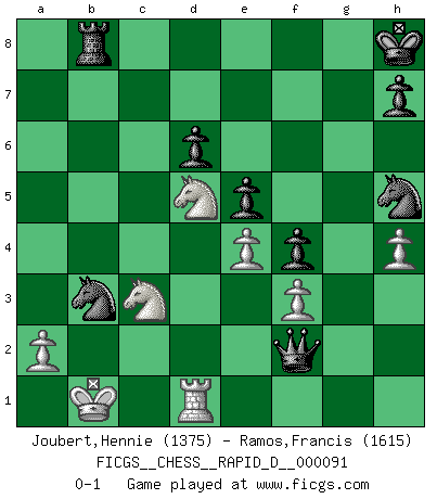 Last move : 0-1 2015 June 18 8:26:7 [Event "FICGS__CHESS__RAPID_D__000091"] [Site "FICGS"] [Date "2015.05.09"] [Round "1"] [White "Joubert,Hennie"] [Black "Ramos,Francis"] [Result "0-1"] [WhiteElo "1375"] [BlackElo "1615"] 1.d4 Nf6 2.c4 g6 3.Nc3 Bg7 4.e4 d6 5.f3 O-O 6.Be3 Nc6 7.Qd2 e5 8.d5 Ne7 9.Nge2 Nd7 10.Nc1 f5 11.Bh6 f4 12.Bxg7 Kxg7 13.Nd3 Nf6 14.O-O-O a6 15.g3 g5 16.gxf4 gxf4 17.h4 Kh8 18.Bh3 Bxh3 19.Rxh3 Qd7 20.Rh2 Rg8 21.R2h1 Rg3 22.Qe2 Rag8 23.Ne1 Nh5 24.Qf2 b5 25.cxb5 axb5 26.Ne2 R3g7 27.Kb1 b4 28.b3 c5 29.dxc6 Nxc6 30.Nc2 Rg2 31.Qe1 Na7 32.Nxb4 Nb5 33.Nd5 Qa7 34.Nec3 Nd4 35.Rf1 Ra8 36.Rd2 Rxd2 37.Qxd2 Nxb3 38.Qf2 Nd4 39.Rd1 Rb8+ 40.Ka1 Nb3+ 41.Kb1 Qxf2 0-1 King's Indian : Saemisch, 6...Nc6 Kingside Castling by player Black (move 5) Queenside Castling by player White (move 14) Player Black won this chess game. Follow this game move after move (download)Chess is a terrible game. If you have no center, your opponent has a freer position. If you do have a center, then you really have something to worry about ! (Siegbert Tarrasch) Die meiste Zeit treffe ich auf Gegner, die meine Enkel sein könnten. Ich bin da, um ihnen zu zeigen, dass sie von mir noch einiges lernen können. (Viktor Kortschnoi) Combinaciones deslumbrantes son para la mayoría, mover madera es para los pocos. (Georg Kieninger) Le temps de noter son nom sur la feuille de partie, j'étais déjà en zeitnot ! D'un modeste amateur apparié lors de la première ronde d'un open contre le grand-maître Azmaïparashvili. Computers have lots of memory but no imagination. (Anonymous)