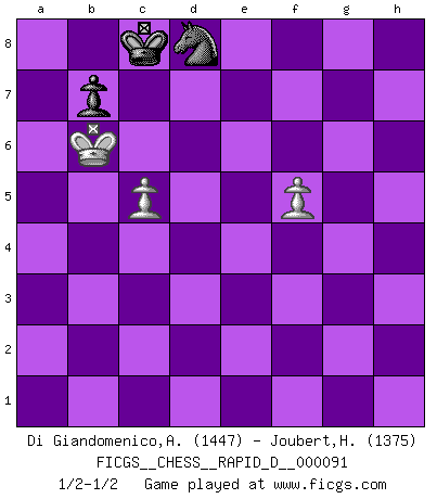 Last move : 1/2-1/2 2015 July 1 16:25:19 [Event "FICGS__CHESS__RAPID_D__000091"] [Site "FICGS"] [Date "2015.05.09"] [Round "1"] [White "Di Giandomenico,Alfonso"] [Black "Joubert,Hennie"] [Result "1/2-1/2"] [WhiteElo "1447"] [BlackElo "1375"] 1.e4 c6 2.Bc4 d5 3.exd5 cxd5 4.Bb3 Nf6 5.Nf3 Bg4 6.d3 e6 7.Be3 Bd6 8.Nbd2 O-O 9.O-O Nc6 10.c3 Rc8 11.d4 Ne4 12.Bc2 Nxd2 13.Bxd2 Qc7 14.h3 Bh5 15.g4 Bg6 16.h4 Bxc2 17.Qxc2 Bf4 18.Ng5 g6 19.h5 Nxd4 20.Qd3 Bxd2 21.Qxd2 Nc6 22.hxg6 hxg6 23.Rae1 Rcd8 24.Qe3 Kg7 25.Qxe6 Rh8 26.Qxf7+ Qxf7 27.Nxf7 Kxf7 28.f4 Rde8 29.Kg2 Rxe1 30.Rxe1 Re8 31.Rd1 Rd8 32.Kf3 d4 33.c4 a5 34.a3 Kf6 35.Ke4 Re8+ 36.Kd5 Re2 37.b4 axb4 38.axb4 Nxb4+ 39.Kxd4 Nc6+ 40.Kc5 Re4 41.Rd6+ Re6 42.Rxe6+ Kxe6 43.Kb6 Nd8 44.f5+ gxf5 45.gxf5+ Kd7 46.c5 Kc8 1/2-1/2 Caro-Kann : Hillbilly attack Kingside Castling by player Black (move 8) Kingside Castling by player White (move 9) 10 pieces endgame at move 39 : White KRPPP , Black KRNPP WHITE : King + 1 Rook 3 Pawns BLACK : King + 1 Rook 1 Knight 2 Pawns 9 pieces endgame at move 42 : White KRPPP , Black KNPP WHITE : King + 1 Rook 3 Pawns BLACK : King + 1 Knight 2 Pawns 8 pieces endgame at move 42 : White KPPP , Black KNPP WHITE : King + 3 Pawns BLACK : King + 1 Knight 2 Pawns 7 pieces endgame at move 44 : White KPP , Black KNPP WHITE : King + 2 Pawns BLACK : King + 1 Knight 2 Pawns 6 pieces endgame at move 45 : White KPP , Black KNP WHITE : King + 2 Pawns BLACK : King + 1 Knight 1 Pawn This chess game ended in a draw. Follow this game move after move (download)Some sacrifices are sound; the rest are mine. (Mikhail Tal) Alles was am Schachbrett zählt sind gute Züge. (Robert James Fischer) Un juego de Ajedrez es un dialogo, una conversación entre un jugador y su oponente. Cada movimiento del oponente puede contener amenazas o tropiezos, pero un jugador no se puede defender de las amenazas o tomar ventaja de los tropiezos si es que no se pregunta a sí mismo: ¿Que es lo que mi oponente va a hacer después de cada movida?. (Bruce A. Moon) Les Echecs sont et restent toujours un combat, un combat intégral comme la boxe, la lutte ou un autre sport, et où il doit y avoir un vainqueur et un vaincu. (Joseph Emil Diemer) Success without honor is an unseasoned dish; it will satisfy your hunger, but it won't taste good. (Joe Paterno)