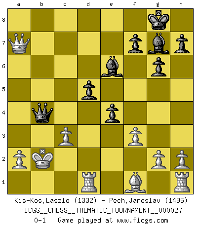 Last move : 0-1 2007 May 10 19:2:4 [Event "FICGS__CHESS__THEMATIC_TOURNAMENT__000027"] [Site "FICGS"] [Date "2007.03.03"] [Round "1"] [White "Kis-Kos,Laszlo"] [Black "Pech,Jaroslav"] [Result "0-1"] [WhiteElo "1332"] [BlackElo "1495"] 1.e4 c5 2.Nf3 d6 3.d4 cxd4 4.Nxd4 Nf6 5.Nc3 g6 6.Be3 Bg7 7.f3 O-O 8.Qd2 Nc6 9.O-O-O d5 10.exd5 Nxd5 11.Nxc6 bxc6 12.Bd4 e5 13.Bc5 Be6 14.Bxf8 Qxf8 15.Nxd5 cxd5 16.Qa5 Rb8 17.Qxa7 e4 18.c3 Rxb2 19.Kxb2 Qb4+ 0-1 Sicilian : Dragon, Yugoslav attack, 7...O-O Kingside Castling by player Black (move 7) Queenside Castling by player White (move 9) Player Black won this chess game. Follow this game move after move (download)The winner of the game is the player who makes the next-to-last mistake. (Savielly Tartakover) Mit sehr nachdenklichem Gesicht schreitet Bobby durch den Turniersaal. Was ist passiert?, fragt Lombardy. Ich stehe schlecht, antwortet Fischer. Lombardy: Dann biete doch einfach Remis an. Fischer: So schlecht stehe ich nun auch wieder nicht! (Robert James Fischer) El Ajedrez es la vida. (Bobby Fischer) Les Cavaliers se révèlent fort utiles dans les positions fermées. D'habitude, les Fous sont un peu plus forts que les Cavaliers dans les positions ouvertes. Qu'on le veuille ou non, il restera toujours des exceptions ! For a mechanic, you seem to do an excessive amount of thinking. (C-3PO in Star Wars ep.2)