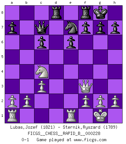 Last move : 0-1 2015 July 12 4:18:31 [Event "FICGS__CHESS__RAPID_B__000228"] [Site "FICGS"] [Date "2015.05.10"] [Round "1"] [White "Lubas,Jozef"] [Black "Sternik,Ryszard"] [Result "0-1"] [WhiteElo "1821"] [BlackElo "1789"] 1.e4 c5 2.c3 d5 3.exd5 Qxd5 4.d4 Nf6 5.Nf3 e6 6.Be2 Nc6 7.O-O cxd4 8.Nxd4 Bd7 9.Bf3 Qa5 10.Nxc6 Bxc6 11.Bxc6+ bxc6 12.Nd2 Be7 13.Nc4 Qc7 14.Bg5 Rd8 15.Qf3 O-O 16.Rfe1 Nd5 17.Bxe7 Nxe7 0-1 This chess game has been lost on time (started : 2015.05.10 7:29:50) Sicilian : Alapin's variation (2.c3) Kingside Castling by player White (move 7) Kingside Castling by player Black (move 15) Player Black won this chess game. Follow this game move after move (download)Morphy was probably the greatest genius of them all. (Bobby Fischer) Schach verlangt totale Konzentration. (Robert James Fischer) Ayuda a tus piezas para que ellas te puedan ayudar. (Paul Morphy) Le jeu d'échecs fait naître et fortifie en nous plusieurs qualités précieuses dans le cours de l'existence, telles que la prévoyance, la circonspection, la prudence, et la persévérance. (Benjamin Franklin - 1783, la morale des échecs) If everyone is thinking alike, then somebody isn't thinking. (US General George S. Patton)