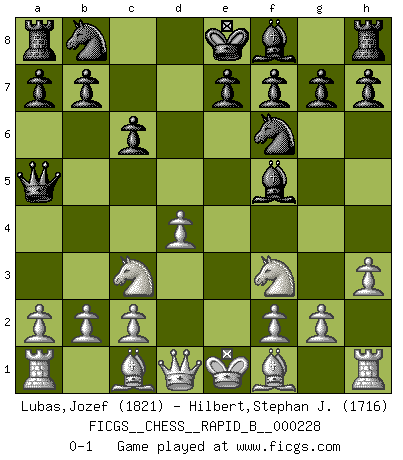 Last move : 0-1 2015 July 16 17:9:34 [Event "FICGS__CHESS__RAPID_B__000228"] [Site "FICGS"] [Date "2015.05.10"] [Round "1"] [White "Lubas,Jozef"] [Black "Hilbert,Stephan J."] [Result "0-1"] [WhiteElo "1821"] [BlackElo "1716"] 1.e4 d5 2.exd5 Qxd5 3.Nc3 Qa5 4.d4 Nf6 5.Nf3 c6 6.h3 Bf5 0-1 This chess game has been lost on time (started : 2015.05.10 7:29:50) Scandinavian (centre counter) defense Player Black won this chess game. Follow this game move after move (download)The chessboard is the world, the pieces are the phenomena of the Universe, the rules of the game are what we call the laws of Nature and the player on the other side is hidden from us. (Thomas Huxley) Modernes Schach sorgt sich zuviel um Dinge wie Bauernstruktur usw. Vergessen Sie das, Schachmatt beendet das Spiel! (Nigel Short) El Ajedrez es el arte del análisis. (Mikhail Botvinnik) A ce moment-là, je menaçais de comprendre la position ! (Clément L'Heureux) It's not the size of the dog in the fight, it's the size of the fight in the dog. (Mark Twain)