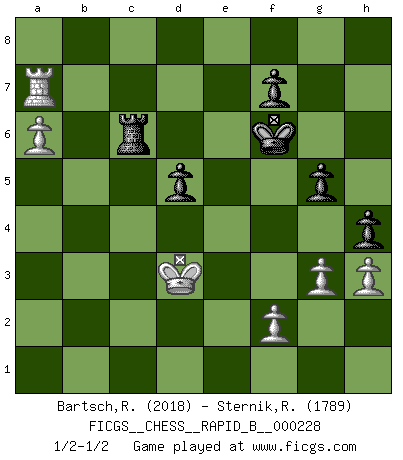 Last move : 1/2-1/2 2015 June 14 20:21:43 [Event "FICGS__CHESS__RAPID_B__000228"] [Site "FICGS"] [Date "2015.05.10"] [Round "1"] [White "Bartsch,Reinhard Andrea"] [Black "Sternik,Ryszard"] [Result "1/2-1/2"] [WhiteElo "2018"] [BlackElo "1789"] 1.d4 d5 2.c4 c6 3.Nf3 Nf6 4.Nc3 dxc4 5.a4 Bf5 6.e3 e6 7.Bxc4 Bb4 8.Bd2 c5 9.Bb5+ Nc6 10.O-O O-O 11.Bxc6 bxc6 12.Ne2 Rb8 13.Bxb4 Rxb4 14.Rc1 Rxb2 15.Rxc5 Ne4 16.Rxc6 Qa8 17.d5 exd5 18.Nfd4 Bd7 19.Rc7 Rb7 20.Rc1 Qe8 21.a5 Ba4 22.Qd3 Bb5 23.Qb3 Qd7 24.Nxb5 Rxb5 25.Qa4 Qb7 26.Nd4 Rc5 27.Nf5 Rxc1 28.Rxc1 g6 29.a6 Qb2 30.Ne7+ Kg7 31.Qd4+ Qxd4 32.exd4 Nd6 33.Rc7 Nb5 34.Rb7 Nxd4 35.Rxa7 Nc6 36.Nxc6 Rc8 37.Kf1 Rxc6 38.Ke2 Kf6 39.Kd3 g5 40.h3 h5 41.g3 h4 1/2-1/2 QGD Slav : Dutch variation Kingside Castling by player White (move 10) Kingside Castling by player Black (move 10) This chess game ended in a draw. Follow this game move after move (download)Mistrust is the most necessary characteristic of the Chess player. (Siegbert Tarrasch) Es liegt in der Natur, vernüftig zu denken und unlogisch zu handeln. (Anatole France) El Ajedrez es parte de una cultura y si una cultura esta en decadencia, entonces también el Ajedrez declinará. (Mikhail Botvinnik) Dieu déplace le joueur, et celui-ci la pièce. Quel Dieu derrière Dieu commence donc la trame ? Arturo Perez-Reverte (prix de littérature policière 1993). I don't know, I don't care, and it doesn't make any difference. (Albert Einstein)