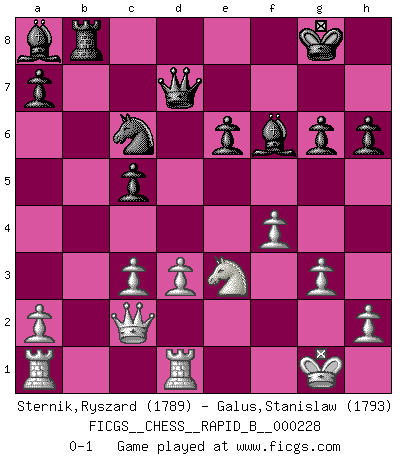 Last move : 0-1 2015 June 13 18:3:39 [Event "FICGS__CHESS__RAPID_B__000228"] [Site "FICGS"] [Date "2015.05.10"] [Round "1"] [White "Sternik,Ryszard"] [Black "Galus,Stanislaw"] [Result "0-1"] [WhiteElo "1789"] [BlackElo "1793"] 1.e4 e6 2.Qe2 c5 3.Nf3 Nc6 4.g3 g6 5.Bg2 Bg7 6.O-O Nge7 7.c3 O-O 8.Na3 d5 9.d3 b6 10.e5 Ba6 11.Nc2 h6 12.Ne3 d4 13.cxd4 Nxd4 14.Nxd4 Qxd4 15.Bxa8 Rxa8 16.Qf3 Rb8 17.Rd1 Bb7 18.Qf4 Qd7 19.Bd2 Nc6 20.Qa4 Ba8 21.Bc3 b5 22.Qc2 b4 23.f4 f6 24.exf6 bxc3 25.bxc3 Bxf6 0-1 French : Chigorin variation Kingside Castling by player White (move 6) Kingside Castling by player Black (move 7) Player Black won this chess game. Follow this game move after move (download)A thorough understanding of the typical mating continuations makes the most complicated sacrificial combinations leading up to them not only not difficult, but almost a matter of course. (Siegbert Tarrasch) Zum Sieg gelangt man nicht, wenn man gut, sondern nur wenn man besser spielt (Savielly Grigorievitsch Tartakower) En partidas rápidas, el Caballo es mas poderoso que el Alfil. (Vlastimil Hort) Les Echecs ont trois composantes : le temps, l'espace et le matériel en dernier. (Mikhail Tal) Whenever people agree with me, I always feel I must be wrong. (Oscar Wilde)