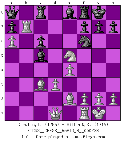 Last move : 1-0 2015 August 17 21:2:19 [Event "FICGS__CHESS__RAPID_B__000228"] [Site "FICGS"] [Date "2015.05.10"] [Round "1"] [White "Cirulis,Ilmars"] [Black "Hilbert,Stephan J."] [Result "1-0"] [WhiteElo "1786"] [BlackElo "1716"] 1.b4 e5 2.a3 d5 3.e3 Nf6 4.Bb2 Nbd7 5.c4 Be7 6.cxd5 Nxd5 7.Nc3 N5f6 8.Nf3 O-O 9.d3 c6 10.Be2 Qc7 11.Rc1 Nb6 12.O-O Bd7 13.b5 Rac8 14.a4 Qb8 15.a5 Nbd5 16.Nxd5 Nxd5 17.bxc6 bxc6 18.Bxe5 Qb4 19.e4 Nf6 20.Bc3 Qb7 21.Rb1 Qa8 22.Ne5 Be8 23.a6 Bc5 24.Rb7 1-0 This chess game has been lost on time (started : 2015.05.10 7:29:50) Polish (Sokolsky) opening Kingside Castling by player Black (move 8) Kingside Castling by player White (move 12) Player White won this chess game. Follow this game move after move (download)Chess is not like life... it has rules ! (Mark Pasternak) Um sich vor der Gefahr einer Erkältung zu schützen, sorge der wanderlustige König beizeiten für ein brauchbares Versteck. (Aaron Nimzowitsch) El hombre es un frívolo, una creatura engañosa y como un jugador de Ajedrez, se preocupa mas por el proceso de obtener su meta que de la meta por sí misma. (Dostoyevsky) Le système Elo représente seulement une moyenne. Il est simplement un indicateur de votre stabilité. (Anatoli Karpov) For to win one hundred victories in one hundred battles is not the acme of skill. To subdue the enemy without fighting is the acme of skill. (Sun Tzu)