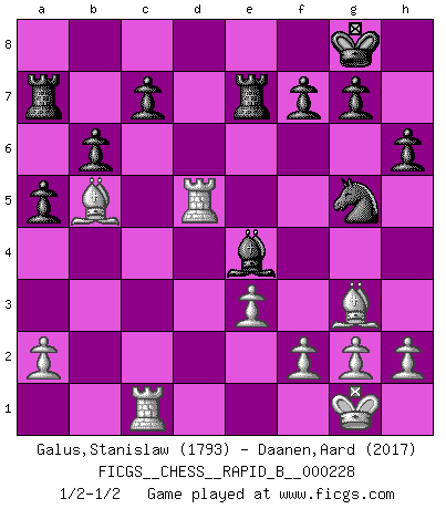 Last move : 1/2-1/2 2015 June 1 9:39:9 [Event "FICGS__CHESS__RAPID_B__000228"] [Site "FICGS"] [Date "2015.05.10"] [Round "1"] [White "Galus,Stanislaw"] [Black "Daanen,Aard"] [Result "1/2-1/2"] [WhiteElo "1793"] [BlackElo "2017"] 1.d4 Nf6 2.c4 e5 3.dxe5 Ng4 4.Bf4 Nc6 5.Nf3 Bb4+ 6.Nbd2 Qe7 7.e3 Ngxe5 8.Nxe5 Nxe5 9.Be2 O-O 10.O-O Bxd2 11.Qxd2 d6 12.Qd5 Re8 13.Rfd1 Nd7 14.b4 a5 15.c5 dxc5 16.bxc5 Nxc5 17.Rac1 Ne6 18.Be5 h6 19.Bg3 Ra7 20.Bd3 b6 21.Qe4 Ng5 22.Qxe7 Rxe7 23.Bb5 Bf5 24.Rd5 Be4 1/2-1/2 Budapest : Rubinstein variation Kingside Castling by player Black (move 9) Kingside Castling by player White (move 10) This chess game ended in a draw. Follow this game move after move (download)You are for me the Queen on d8 and I am the Pawn on d7 !! (Eduard Gufeld) Der Knackpunkt bei der Konzentration ist, daß wir nur durch sie etwas Neues und Ungewöhnliches am Schachbrett finden können. Sie ist der einzige Weg durch neue neue Ideen eine Überraschung zu bereiten. (Garry Kasparov) ¡Examina movidas que hagan daño! Un buen ojo for movidas desvastantes es mucho mas importante que el conocimiento de principios estratégicos. (Purdy) Si rien de grave n'est détecté lors de l'analyse d'une position, on joue alors le coup. Seconde règle de Blumenfeld. Is not life a hundred times too short to bore ourselves ? (Friedrich Nietzsche)