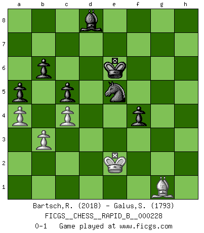 Last move : 0-1 2015 June 24 8:33:2 [Event "FICGS__CHESS__RAPID_B__000228"] [Site "FICGS"] [Date "2015.05.10"] [Round "1"] [White "Bartsch,Reinhard Andrea"] [Black "Galus,Stanislaw"] [Result "0-1"] [WhiteElo "2018"] [BlackElo "1793"] 1.d4 Nf6 2.c4 g6 3.Nf3 Bg7 4.Nc3 O-O 5.e4 d6 6.Be2 e5 7.O-O Na6 8.Be3 Ng4 9.Bg5 Qe8 10.h3 h6 11.Bh4 exd4 12.Nxd4 Nf6 13.f3 Nh5 14.Qd2 Qe5 15.Bf2 Nf4 16.Nd5 Nxe2+ 17.Qxe2 f5 18.f4 Qe8 19.Nb5 Rf7 20.e5 dxe5 21.fxe5 c6 22.Nd6 Qxe5 23.Qxe5 Bxe5 24.Nxf7 Kxf7 25.Nc3 Nb4 26.Rad1 Be6 27.Bd4 Bc7 28.Bc5 Na6 29.Bf2 b6 30.b3 g5 31.a3 Rd8 32.Rxd8 Bxd8 33.Ne2 c5 34.Rd1 Be7 35.g3 Nb8 36.Nc3 Nc6 37.Nd5 Bf8 38.Nc7 Be7 39.Nxe6 Kxe6 40.Re1+ Kf7 41.Kg2 Bf6 42.h4 Ne5 43.Rh1 a5 44.Rd1 Ke6 45.a4 Ng4 46.hxg5 hxg5 47.Bg1 Ke7 48.Kf3 Ke6 49.Rd5 Ne5+ 50.Ke2 f4 51.gxf4 gxf4 52.Rd8 Bxd8 0-1 King's Indian, 3.Nf3 Kingside Castling by player Black (move 4) Kingside Castling by player White (move 7) Player Black won this chess game. Follow this game move after move (download)No Chess Grandmaster is normal; they only differ in the extent of their madness. (Viktor Korchnoi) Dieses schreckliche Gefühl, dass ich gegen eine Maschine spielte, die niemals Fehler macht, zerschmetterte meinen Widerstand. (Mark Taimanov) Observen a Garry Kasparov. Después de una derrota, invariablemente el gana la próxima partida. Prácticamente hace pedazos a su siguiente oponente. Eso es algo que tenemos que aprender a lograr. (Maurice Ashley) On croit qu'il y a plus de mauvais joueurs que de bons joueurs, c'est faux : Il y a autant de joueurs qui gagnent que de joueurs qui perdent. (Philippe Geluck) Thus, what is of supreme importance in war is to attack the enemy's strategy. (Sun Tzu)