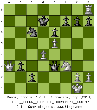 Last move : 0-1 2015 May 24 15:50:38 [Event "FICGS__CHESS__THEMATIC_TOURNAMENT__000192"] [Site "FICGS"] [Date "2015.05.10"] [Round "1"] [White "Ramos,Francis"] [Black "Simmelink,Joop"] [Result "0-1"] [WhiteElo "1615"] [BlackElo "2313"] 1.d4 d5 2.c4 e6 3.Nc3 c6 4.Nf3 dxc4 5.a4 Bb4 6.e4 b5 7.Bd2 a5 8.axb5 Bxc3 9.Bxc3 cxb5 10.b3 Nf6 11.e5 Nd5 12.Qc2 b4 13.Bd2 c3 14.Bc1 a4 15.bxa4 Nc6 16.Bb5 Qb6 17.O-O Ba6 18.Be3 Bxb5 19.axb5 Rxa1 20.Rxa1 Qxb5 21.Ra8+ Kd7 22.Rxh8 b3 23.Qb1 Nxe3 24.fxe3 c2 25.Qb2 Qe2 26.Qa3 Qxe3+ 0-1 QGD : Semi-Slav, Noteboom variation Kingside Castling by player White (move 17) Player Black won this chess game. Follow this game move after move (download)Chess is ruthless: you've got to be prepared to kill people. (Nigel Short) Wenn du nicht weißt was du tun sollst, warte bis dein Gegner eine Idee hat. Sie wird sicher schlecht sein. (Siegbert Tarrasch) El Ajedrez tiene tanto misterio como las mujeres. (Purdy) Echiquier : carré parfait, comme la Jérusalem nouvelle décrite par l'auteur de l'Apocalypse, huit cases sur huit, exaltation du chiffre 4, symbole du cosmos aux quatre horizons... où le noir et le blanc, l'ombre et la lumière, le mal et le bien s'entremêlent et se conjuguent. (Robert Couffignal, Le Gambit du poète) My poor ole parrot... Is not in the circulation of displays ....poo hoo hoo :) (Wayne Lowrance's enigma)