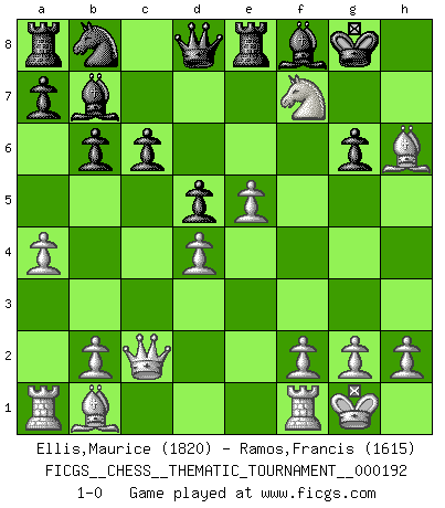 Last move : 1-0 2015 May 24 16:25:8 [Event "FICGS__CHESS__THEMATIC_TOURNAMENT__000192"] [Site "FICGS"] [Date "2015.05.10"] [Round "1"] [White "Ellis,Maurice"] [Black "Ramos,Francis"] [Result "1-0"] [WhiteElo "1820"] [BlackElo "1615"] 1.d4 d5 2.c4 e6 3.Nc3 c6 4.Nf3 dxc4 5.a4 Nf6 6.e3 Bd6 7.Bxc4 O-O 8.O-O b6 9.e4 Bb4 10.e5 Nd5 11.Qc2 h6 12.Ba2 Bb7 13.Nxd5 exd5 14.Bb1 g6 15.Bxh6 Re8 16.Ng5 Bf8 17.Nxf7 1-0 QGD : Semi-Slav, Noteboom variation Kingside Castling by player Black (move 7) Kingside Castling by player White (move 8) Player White won this chess game. Follow this game move after move (download)The beauty of a move lies not in its' appearance but in the thought behind it. (Siegbert Tarrasch) Es ist peinlich, dass ich nie Weltmeister wurde. Es wäre leicht, Leonid Breschnjew als Ursache vorzuschieben, dessen Apparat den Vorzeigekommunisten Anatoli Karpow in allem unterstützte. Aber Garri Kasparow zum Beispiel, der ebenfalls von den Sowjets unerwünscht war, hat trotz der Widerstände den WM-Titel erobert. (Viktor Kortschnoi) Yo no le temo a Spassky. Todos saben que yo soy el mejor. Uno no necesita un torneo para probarlo. (Bobby Fischer) Le profane ne songe pas à la somme de jouissance dont il se prive, qui méconnaît ce jeu aux ressources aussi variées que passionnantes. (Jean-Marie Jeanton-Lamarche) He who is a good ruler must first have been ruled. (Aristotle)