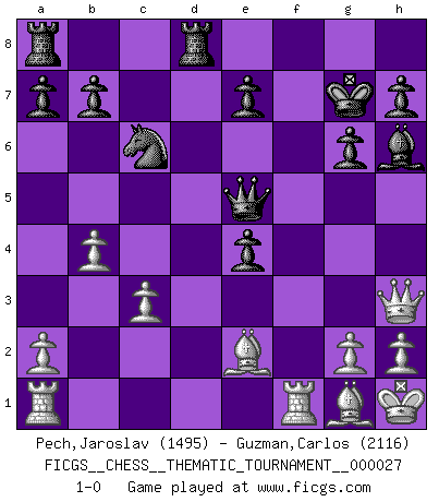 Last move : 1-0 2007 September 11 7:52:14 [Event "FICGS__CHESS__THEMATIC_TOURNAMENT__000027"] [Site "FICGS"] [Date "2007.03.03"] [Round "1"] [White "Pech,Jaroslav"] [Black "Guzman,Carlos"] [Result "1-0"] [WhiteElo "1495"] [BlackElo "2116"] 1.e4 c5 2.Nf3 d6 3.d4 cxd4 4.Nxd4 Nf6 5.Nc3 g6 6.Be3 Bg7 7.Be2 Nc6 8.O-O O-O 9.Nb3 Be6 10.f4 Qc8 11.Kh1 Rd8 12.Bg1 d5 13.e5 Ne4 14.Nxe4 dxe4 15.Qe1 f6 16.Nc5 fxe5 17.Nxe6 Qxe6 18.c3 Bh6 19.Qh4 Kg7 20.fxe5 Qxe5 21.Qh3 Qd5 22.b3 Qe5 23.b4 1-0 This chess game has been lost on time (started : 2007.03.03 20:53:57) Sicilian : Dragon, Classical attack Kingside Castling by player White (move 8) Kingside Castling by player Black (move 8) Player White won this chess game. Follow this game move after move (download)Chess is like life. (Boris Spassky) Es tut gut, die Entwicklungsperiode von, [...] demokratischem Geist durchdringen zu lassen. Wie undemokratisch wäre es doch beispielsweise, den einen Offizier große Spaziertouren vornehmen zu lassen, während die anderen zu Hause säßen und sich entsetzlich langweilten. (Aaron Nimzowitsch) Aún el Rey más flojo huye despavorido ante la amenaza de un Jaque doble. (Aaron Nimzowitsch) On entre au jeu d'Echecs comme on entre en Religion. Pour le joueur d'Echecs, la partie d'Echecs c'est l'office, la messe, le défilé du 1er Mai, le dépôt de gerbe au Monument aux Morts. C'est un drame sacré. (Michel Roos) Computer Science is no more about computers than astronomy is about telescopes. (Edsger W. Dijkstra)