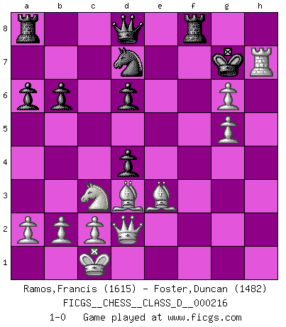 Last move : 1-0 2015 June 3 13:27:9 [Event "FICGS__CHESS__CLASS_D__000216"] [Site "FICGS"] [Date "2015.05.11"] [Round "1"] [White "Ramos,Francis"] [Black "Foster,Duncan"] [Result "1-0"] [WhiteElo "1615"] [BlackElo "1482"] 1.e4 b6 2.Nc3 Bb7 3.d4 e6 4.Bd3 a6 5.f3 h6 6.Be3 g6 7.Nge2 d6 8.Qd2 Bg7 9.g4 g5 10.Ng3 Ne7 11.Nh5 O-O 12.h4 f6 13.O-O-O Nd7 14.f4 Ng6 15.hxg5 hxg5 16.fxg5 f5 17.gxf5 exf5 18.exf5 Bxh1 19.Rxh1 c5 20.fxg6 cxd4 21.Nxg7 Kxg7 22.Rh7+ 1-0 Owen defense Kingside Castling by player Black (move 11) Queenside Castling by player White (move 13) Player White won this chess game. Follow this game move after move (download)Chess is a terrible game. If you have no center, your opponent has a freer position. If you do have a center, then you really have something to worry about ! (Siegbert Tarrasch) Der vorletzte Fehler gewinnt. (Savielly Grigorievitsch Tartakower) No soy una persona materialista y por eso, no resiento la falta o pérdida del dinero. La ausencia de cosas mundanas carece de importancia. Ya que el Ajedrez es una forma en la que puedo ser tan materialista como yo desee sin tener la necesidad de vender mi alma. (Jamie Walter Adams) Vous n'êtes pas toujours obligé de jouer le meilleur coup. Un coup doit être actif, entreprenant, correct et beau ! (David Bronstein) Wawaweewa ! (Borat: Cultural learnings of America for make benefit glorious nation of Kazakhstan)