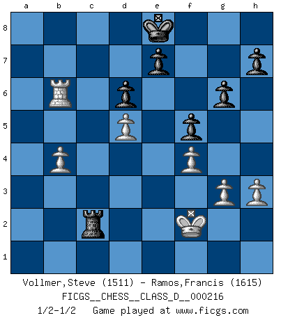 Last move : 1/2-1/2 2015 June 22 17:59:42 [Event "FICGS__CHESS__CLASS_D__000216"] [Site "FICGS"] [Date "2015.05.11"] [Round "1"] [White "Vollmer,Steve"] [Black "Ramos,Francis"] [Result "1/2-1/2"] [WhiteElo "1511"] [BlackElo "1615"] 1.Nf3 Nf6 2.d4 g6 3.g3 Bg7 4.Bg2 O-O 5.c4 d6 6.O-O c5 7.Nc3 cxd4 8.Nxd4 Qc7 9.Nd5 Nxd5 10.cxd5 Qb6 11.Nb3 Na6 12.Be3 Qd8 13.Qd2 Bd7 14.Bd4 Rc8 15.Bxg7 Kxg7 16.Qd4+ Kg8 17.Rfc1 b6 18.e4 Nc5 19.Nxc5 Rxc5 20.b4 Rxc1+ 21.Rxc1 Bb5 22.Qc3 Qd7 23.Qc7 Rd8 24.Qxd7 Rxd7 25.Bh3 Rd8 26.Rc7 a5 27.a3 Kf8 28.Rb7 axb4 29.axb4 Bd3 30.Rxb6 Bxe4 31.Bg2 Bd3 32.f4 f5 33.Bf1 Be4 34.Bg2 Bd3 35.Kf2 Ke8 36.Ke3 Bc4 37.Kd4 Be2 38.h3 Rc8 39.Ke3 Rc2 40.Bf3 Bxf3 41.Kxf3 Rc3+ 42.Kf2 Rc2+ 43.Ke3 Rc3+ 44.Kf2 Rc2+ 45.Ke3 Rc3+ 46.Kf2 Rc2+ 1/2-1/2 Reti Opening Kingside Castling by player Black (move 4) Kingside Castling by player White (move 6) This chess game ended in a draw. Follow this game move after move (download)When the Chess game is over, the Pawn and the King go back to the same box. (Irish saying) Frage: Gibt es etwas was Sie mehr lieben als Autobahnen ohne Tempobegrenzungen? - Antwort: Deutsche Frauen ohne Tempobegrenzungen. (Loek van Wely) Aunque la mayoría de la gente disfruta observar las partidas de los grandes Maestros de ataque, algunos de los jugadores mas notables en la historia han sido los jugadores silenciosos posicionales. Lentamente ellos te aplastan despojandote de tu espacio, congestionando tus piezas y dejandote virtualmente sin nada que hacer. (Yasser Seirawan) Les erreurs sont comme les malheurs, elles n'arrivent jamais seules. (Siegbert Tarrasch) Methinks King Thibault should dub Marius Zubac a knight of the square board... I mean table, henceforth addressing him as Sir Marius, and bestow on him a suitable land from the kingdom of FICGS & marry him off to a worthy, fair maiden, lest he slice our heads with his mighty sword in his wrath. (Dinesh De Silva)