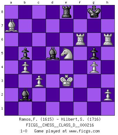 Last move : 1-0 2015 October 21 15:48:1 [Event "FICGS__CHESS__CLASS_D__000216"] [Site "FICGS"] [Date "2015.05.11"] [Round "1"] [White "Ramos,Francis"] [Black "Hilbert,Stephan J."] [Result "1-0"] [WhiteElo "1615"] [BlackElo "1716"] 1.e4 d6 2.d4 g6 3.Nc3 Bg7 4.Be3 a6 5.Bc4 Nf6 6.Nge2 O-O 7.O-O b5 8.Bb3 Bb7 9.f3 Nbd7 10.Qd2 c5 11.dxc5 Nxc5 12.Rad1 b4 13.Nd5 Nxb3 14.axb3 Nxd5 15.exd5 Bxb2 16.Qxb4 Qd7 17.c3 Qb5 18.Qxb5 axb5 19.Rd2 Ba3 20.b4 Rfc8 21.f4 Rc4 22.Kf2 Ra6 23.Re1 e6 24.dxe6 fxe6 25.Bd4 Bd5 26.Ra1 Rc8 27.Ng1 Rf8 28.Ke3 Bc4 29.Nf3 e5 30.fxe5 dxe5 31.Nxe5 Re8 32.Ke4 Bb3 33.Kf4 Rf6+ 34.Ke4 Ra6 35.Rf2 Bc4 36.g4 g5 37.Rf5 h6 38.Kf3 Bd5+ 39.Ke3 R6a8 40.Rf6 Kg7 41.Raf1 Bb2 42.Rg6+ Kh7 43.R1f6 Ra7 44.Rxh6+ Kg8 45.Bxa7 1-0 King's pawn Opening Kingside Castling by player Black (move 6) Kingside Castling by player White (move 7) Player White won this chess game. Follow this game move after move (download)Bobby Fischer's current state of mind is indeed a tragedy. One of the world's greatest Chess players - the pride and sorrow of American Chess. (Frank Brady) Fischer machte Schach einfach zu einer aufregenden Sache, wann immer er sich ans Brett setzte. (Raymond Keene) El poder defensivo de una pieza clavada, solamente es imaginario. (Aaron Nimzovich) Les ravages du H expliquent la différence de niveau entre Tal et Thal [Abergel]. The only thing that matters is the evidence. (Horatio Caine, C.S.I. Miami)