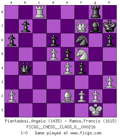 Last move : 1-0 2015 June 17 15:43:19 [Event "FICGS__CHESS__CLASS_D__000216"] [Site "FICGS"] [Date "2015.05.11"] [Round "1"] [White "Piantadosi,Angelo"] [Black "Ramos,Francis"] [Result "1-0"] [WhiteElo "1435"] [BlackElo "1615"] 1.d4 Nf6 2.c4 g6 3.Nc3 Bg7 4.e4 d6 5.Nf3 O-O 6.Be2 e5 7.d5 Nbd7 8.O-O Re8 9.Bg5 h6 10.Bh4 Nf8 11.h3 g5 12.Bg3 Ng6 13.Rc1 Nf4 14.Bxf4 gxf4 15.b4 Kh7 16.c5 Bd7 17.cxd6 cxd6 18.Nb5 Bxb5 19.Bxb5 Re7 20.Nh4 Rc7 21.Qd2 Rxc1 22.Rxc1 a6 23.Be2 Qb6 24.Nf5 Rg8 25.Qc3 Bf8 26.Qc7 Qxb4 27.Qxf7+ Bg7 28.Rc8 1-0 King's Indian : Petrosian system, Main line Kingside Castling by player Black (move 5) Kingside Castling by player White (move 8) Player White won this chess game. Follow this game move after move (download)Excellence at Chess is one mark of a scheming mind. (Sir Arthur Conan Doyle) Bis jetzt ist Weiß einer wohlbekannten Analyse gefolgt. Aber jetzt begeht er einen schrecklichen Fehler: Er beginnt seinen eigenen Kopf zu benutzen. (Siegbert Tarrasch) Los errores estan ahí, esperando a que se cometan. (Savielly Tartakower) La guerre est enfant de la passion, la passion est enfant du narcissisme et le narcissisme est l'enfant. (...) Une autre partie ? (Thibault de Vassal) True nature is revealed in times of difficulty. (Chinese proverb)
