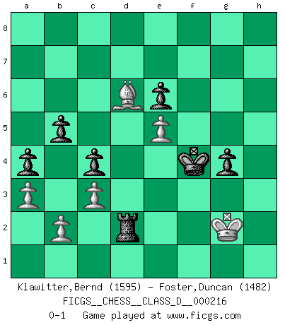Last move : 0-1 2015 July 13 21:17:33 [Event "FICGS__CHESS__CLASS_D__000216"] [Site "FICGS"] [Date "2015.05.11"] [Round "1"] [White "Klawitter,Bernd"] [Black "Foster,Duncan"] [Result "0-1"] [WhiteElo "1595"] [BlackElo "1482"] 1.e4 b6 2.d4 Bb7 3.Bd3 e6 4.Ne2 a6 5.Ng3 g6 6.c3 Bg7 7.O-O d6 8.Qc2 h6 9.Be3 Ne7 10.Nd2 O-O 11.f4 Nd7 12.Nf3 d5 13.e5 Nf5 14.Nxf5 gxf5 15.Qf2 Kh7 16.Qg3 Bh8 17.Qh3 Rg8 18.Ng5+ Kg7 19.Nf3 Kf8 20.Qxh6+ Bg7 21.Qh4 Qxh4 22.Nxh4 Ke7 23.Nf3 Bh6 24.g3 c5 25.Be2 c4 26.Kf2 f6 27.exf6+ Nxf6 28.Ne5 Ne4+ 29.Kf3 a5 30.a3 b5 31.Rfc1 a4 32.Bd1 Rac8 33.Bc2 Bg7 34.Bxe4 dxe4+ 35.Kf2 Bxe5 36.dxe5 Rcd8 37.Rd1 Rd3 38.Rd2 Rh8 39.h4 Bc6 40.Rad1 Be8 41.Rxd3 exd3 42.Rg1 Bh5 43.Ke1 Rd8 44.Kd2 Rg8 45.Bc5+ Kd7 46.Bd4 Kc6 47.Bf2 Kd5 48.Re1 Be2 49.Rxe2 dxe2 50.Kxe2 Ke4 51.Be1 Rd8 52.Bf2 Rd3 53.h5 Rd7 54.Bd4 Rh7 55.Kf2 Rxh5 56.Kg2 Kd3 57.Kf3 Rh2 58.g4 Rh3+ 59.Kg2 fxg4 60.Bc5 Ke4 61.Bd6 Kxf4 62.Bb8 Rd3 63.Bd6 Rd2+ 0-1 Owen defense Kingside Castling by player White (move 7) Kingside Castling by player Black (move 10) Player Black won this chess game. Follow this game move after move (download)Suddenly it was obvious to me in my analysis I had missed what Fischer had found with the greatest of ease at the board. (Mikhail Botvinnik) Der zweitbeste Zug ist oft der einzig richtige. (Savielly Grigorievitsch Tartakower) La estratégia requiere pensar, la táctica requiere observación. (Max Euwe) Seul un grand joueur sait à quel point il joue faiblement. (Xavier Tartacover) If you don't practice you don't deserve to win. (Andre Agassi)