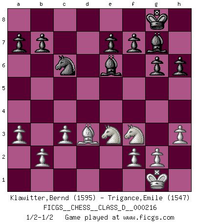 Last move : 1/2-1/2 2015 May 31 17:19:42 [Event "FICGS__CHESS__CLASS_D__000216"] [Site "FICGS"] [Date "2015.05.11"] [Round "1"] [White "Klawitter,Bernd"] [Black "Trigance,Emile"] [Result "1/2-1/2"] [WhiteElo "1595"] [BlackElo "1547"] 1.e4 c5 2.c3 d5 3.exd5 Qxd5 4.d4 Nc6 5.dxc5 Qxc5 6.Be3 Qa5 7.Be2 Nf6 8.Nf3 g6 9.O-O Bg7 10.Na3 O-O 11.Nc4 Qc7 12.h3 Rd8 13.Qc1 Nd5 14.Rd1 Nxe3 15.Rxd8+ Nxd8 16.Nxe3 Be6 17.a3 h6 18.Qc2 Nc6 19.Rd1 Rd8 20.Rxd8+ Qxd8 21.Qd3 Qxd3 22.Bxd3 1/2-1/2 Sicilian : Alapin's variation (2.c3) Kingside Castling by player White (move 9) Kingside Castling by player Black (move 10) This chess game ended in a draw. Follow this game move after move (download)In Chess, as it is played by masters, chance is practically eliminated. (Emanuel Lasker) Ich moechte nie einem Club beitreten, der Leute wie mich als Mitglieder aufnimmt. (Woody Allen) Cuando veas una buena jugada, trata de encontrar otra mejor. (Emanuel Lasker) Votre prénom est 'Tactique', votre deuxième prénom est 'Tactique' et votre nom est 'Tactique'. (Ken Smith) Everybody lies. (Gregory House, House M.D.)