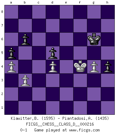 Last move : 0-1 2015 July 16 21:37:39 [Event "FICGS__CHESS__CLASS_D__000216"] [Site "FICGS"] [Date "2015.05.11"] [Round "1"] [White "Klawitter,Bernd"] [Black "Piantadosi,Angelo"] [Result "0-1"] [WhiteElo "1595"] [BlackElo "1435"] 1.e4 Nf6 2.Nc3 d5 3.exd5 Nxd5 4.Nxd5 Qxd5 5.Qf3 e6 6.Qxd5 exd5 7.Be2 Be7 8.Bf3 c6 9.d4 O-O 10.Ne2 Bf5 11.c3 Nd7 12.O-O Rfe8 13.Ng3 Bg6 14.Bd2 Bd6 15.Rfe1 Nf6 16.Nf1 Kf8 17.Be3 Bh5 18.Bxh5 Nxh5 19.h3 Bf4 20.Bxf4 Nxf4 21.Ne3 Re6 22.Rad1 Rae8 23.Kf1 Ng6 24.a3 b6 25.g3 h5 26.Ng2 Rxe1+ 27.Rxe1 Rxe1+ 28.Kxe1 Ke7 29.Ne3 Ke6 30.Kd2 h4 31.Kd3 hxg3 32.fxg3 Ne7 33.b3 Nf5 34.Nxf5 Kxf5 35.Ke3 g5 36.Kf3 f6 37.g4+ Kg6 38.Kg3 f5 39.Kf3 f4 40.h4 gxh4 41.Kxf4 Kf6 42.c4 Kg6 43.cxd5 cxd5 44.a4 a5 0-1 Alekhine's defense : Scandinavian variation Kingside Castling by player Black (move 9) Kingside Castling by player White (move 12) 10 pieces endgame at move 43 : White KPPPP , Black KPPPP WHITE : King + 4 Pawns BLACK : King + 4 Pawns Player Black won this chess game. Follow this game move after move (download)The passed pawn is a criminal, who should be kept under lock and key. Mild measures, such as police surveillance, are not sufficient. (Nimzovitch) Wenn ich mich einlogge, glauben die Leute gewöhnlich nicht, dass ich es selbst bin und sie fangen an, mir dumme Fragen zu stellen. Und wenn sie es glauben, stellen sie wieder andere dumme Fragen. (Judith Polgar) Fischer es el jugador mas fuerte del mundo. De hecho, el jugador mas fuerte que jamas haya existido. (Larry Evans) Fischer est le meilleur joueur du monde et Karpov n'est qu'un joueur de bistrot. (Garry Kasparov, agé de 16 ans) I feel so... helpless. (C-3PO in Star Wars ep.3)