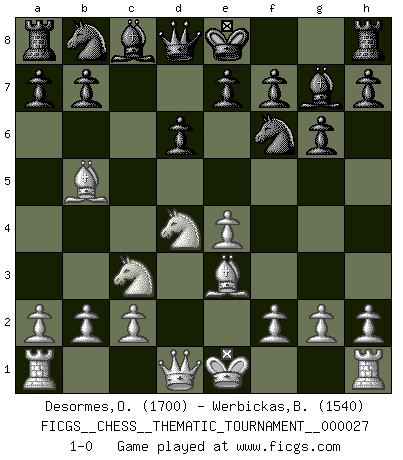 Last move : 1-0 2007 April 16 23:16:29 [Event "FICGS__CHESS__THEMATIC_TOURNAMENT__000027"] [Site "FICGS"] [Date "2007.03.03"] [Round "1"] [White "Desormes,Olivier"] [Black "Werbickas,Brian"] [Result "1-0"] [WhiteElo "1700"] [BlackElo "1540"] 1.e4 c5 2.Nf3 d6 3.d4 cxd4 4.Nxd4 Nf6 5.Nc3 g6 6.Be3 Bg7 7.Bb5+ 1-0 This chess game has been lost on time (started : 2007.03.03 20:53:57) Sicilian : Dragon, 6.Be3 Player White won this chess game. Follow this game move after move (download)The only thing Chess players have in common is Chess. (Lodewijk Prins) Der Schachmeister von Heute braucht Courage, einen Killerinstinkt, Ausdauer und Arroganz. (Larry Evans) Un entendimiento a fondo de las continuaciones típicas del mate, hace de las combinaciones de sacrificio mas complicadas conducirlas a ellas no solo sin dificultad, sino casi de una manera natural. (Siegbert Tarrasch) Je ne suis pas le dernier à jouer lâchement des coups douteux pendant le zeïtnot de l'adversaire pour l'achever: en effet les coups qui font le plus peur sont ceux que l'on ne comprend pas. Je me fais souvent peur quand je joue. (Un professeur anonyme) A shortcut is the longest distance between two points. (Don Groves)