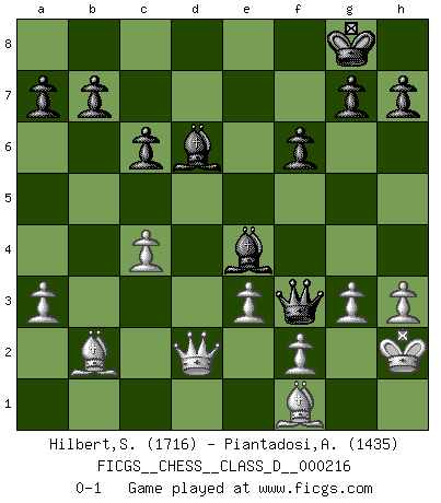 Last move : 0-1 2015 October 13 0:29:37 [Event "FICGS__CHESS__CLASS_D__000216"] [Site "FICGS"] [Date "2015.05.11"] [Round "1"] [White "Hilbert,Stephan J."] [Black "Piantadosi,Angelo"] [Result "0-1"] [WhiteElo "1716"] [BlackElo "1435"] 1.b4 e5 2.Bb2 Bxb4 3.Bxe5 Nf6 4.a3 Be7 5.c4 d6 6.Bb2 O-O 7.e3 Bf5 8.Nf3 Nc6 9.Nc3 Re8 10.Be2 Bf8 11.O-O Qd7 12.d3 Ne5 13.Nxe5 dxe5 14.Qb3 c6 15.Rad1 Rad8 16.d4 exd4 17.Rxd4 Qc7 18.Rfd1 Rxd4 19.Rxd4 Rd8 20.Rxd8 Qxd8 21.h3 Ne4 22.Nxe4 Bxe4 23.Qc3 Qg5 24.Bf1 f6 25.g3 Bd6 26.Kh2 Qf5 27.Qd2 Qf3 0-1 Polish (Sokolsky) opening Kingside Castling by player Black (move 6) Kingside Castling by player White (move 11) Player Black won this chess game. Follow this game move after move (download)The chessboard is the world, the pieces are the phenomena of the Universe, the rules of the game are what we call the laws of Nature and the player on the other side is hidden from us. (Thomas Huxley) Modernes Schach sorgt sich zuviel um Dinge wie Bauernstruktur usw. Vergessen Sie das, Schachmatt beendet das Spiel! (Nigel Short) Al jugar al Ajedrez entonces, podemos aprender: Primero: Previsión... Segundo: Prudencia... Tercero: Cautela... Y al final, aprendemos del Ajedrez el hábito de no ser desanimados por apariencias malas presentes en el estado de nuestros asuntos, el hábito de la esperanza por una oportunidad favorable y la perseveración de los secretos de los recursos. (Benjamin Franklin) Le jeu d'échecs est comme rejeté hors du temps. (Antoine de Saint-Exupéry) When you've done things right people won't know you've done anything at all. (Futurama)