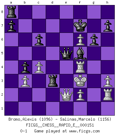Last move : 0-1 2015 August 10 9:0:2 [Event "FICGS__CHESS__RAPID_E__000151"] [Site "FICGS"] [Date "2015.05.11"] [Round "1"] [White "Bromo,Alexis"] [Black "Salinas,Marcelo"] [Result "0-1"] [WhiteElo "1096"] [BlackElo "1156"] 1.d4 e6 2.c4 Qh4 3.Nf3 Qh5 4.e3 Bb4+ 5.Nc3 Bxc3+ 6.bxc3 Nf6 7.h3 Ne4 8.Bb2 Qa5 9.Qc2 Ng5 10.Nxg5 Qxg5 11.Ba3 d6 12.c5 dxc5 13.Bxc5 Nd7 14.Bb5 Qxg2 15.O-O-O c6 16.Ba4 b5 17.Bb3 Nxc5 18.Rdg1 Nxb3+ 19.axb3 Qf3 20.Rh2 g6 21.Rg3 Qd5 22.e4 Qd6 23.e5 Qa3+ 24.Kd2 b4 25.c4 Qa1 26.Rg4 f5 27.exf6 Kf7 28.Rf4 Rd8 29.Ke3 e5 30.dxe5 Qxe5+ 31.Kf3 Bf5 32.Qe2 Rd3+ 0-1 Queen's pawn Queenside Castling by player White (move 15) Player Black won this chess game. Follow this game move after move (download)After a bad opening, there is hope for the middle game. After a bad middle game, there is hope for the endgame. But once you are in the endgame, the moment of truth has arrived. (Edmar Mednis) Ein Schachspiel besteht aus drei Phasen: Die erste, wenn du hofftst den Vorteil zu haben, die zweite, wenn du glaubst einen Vorteil zu haben, und die dritte.... wenn du weißt Du wirst verlieren. (Savielly Grigorievitsch Tartakower) En el Ajedrez, tal como en la vida, las bendiciones de hoy pueden ser el veneno del mañana. (Assaic) On peut tirer plus d'utilité d'une partie perdue que de 100 parties gagnées. (Capablanca) If you have any trouble condescending, find a Unix user to show you how it's done. (Scott Adams)