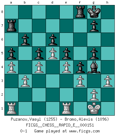 Last move : 0-1 2015 August 12 23:45:9 [Event "FICGS__CHESS__RAPID_E__000151"] [Site "FICGS"] [Date "2015.05.11"] [Round "1"] [White "Puzanov,Vasyl"] [Black "Bromo,Alexis"] [Result "0-1"] [WhiteElo "1255"] [BlackElo "1096"] 1.e4 e5 2.Nf3 Nc6 3.Bb5 d6 4.d4 Bd7 5.d5 Nce7 6.Bd3 h6 7.O-O a6 8.c4 Nf6 9.Nc3 Ng6 10.Be3 Be7 11.Qd2 c5 12.a4 Ng4 13.h3 Nxe3 14.Qxe3 Nf4 15.Ne2 Nxe2+ 16.Qxe2 O-O 17.b3 b6 18.Nh2 Bg5 19.Nf3 f5 20.Rfe1 f4 21.Nxg5 Qxg5 22.Qf3 Be8 23.Be2 a5 24.Qg4 Ra7 25.Qxg5 hxg5 26.Bg4 Bd7 27.f3 Bxg4 0-1 Ruy Lopez : Old Steinitz defense Kingside Castling by player White (move 7) Kingside Castling by player Black (move 16) Player Black won this chess game. Follow this game move after move (download)In the perfect Chess combination as in a first-rate short story, the whole plot and counter-plot should lead up to a striking finale, the interest not being allayed until the very last moment. (Yates and Winter) Es ist nicht das erste mal, dass sich die FIDE dem Arabischen Geld gebeugt hat (über die FIDE WM 2004 in Lybien). (Larry Evans) Por esta medida (el intervalo entre Fischer y sus contemporaneos), yo le considero el mas grande campeón mundial. (Garry Kasparov) RxDa4 pat (...) A married woman is like a fish riding a bicycle. (Rodolfo d'Ettorre)